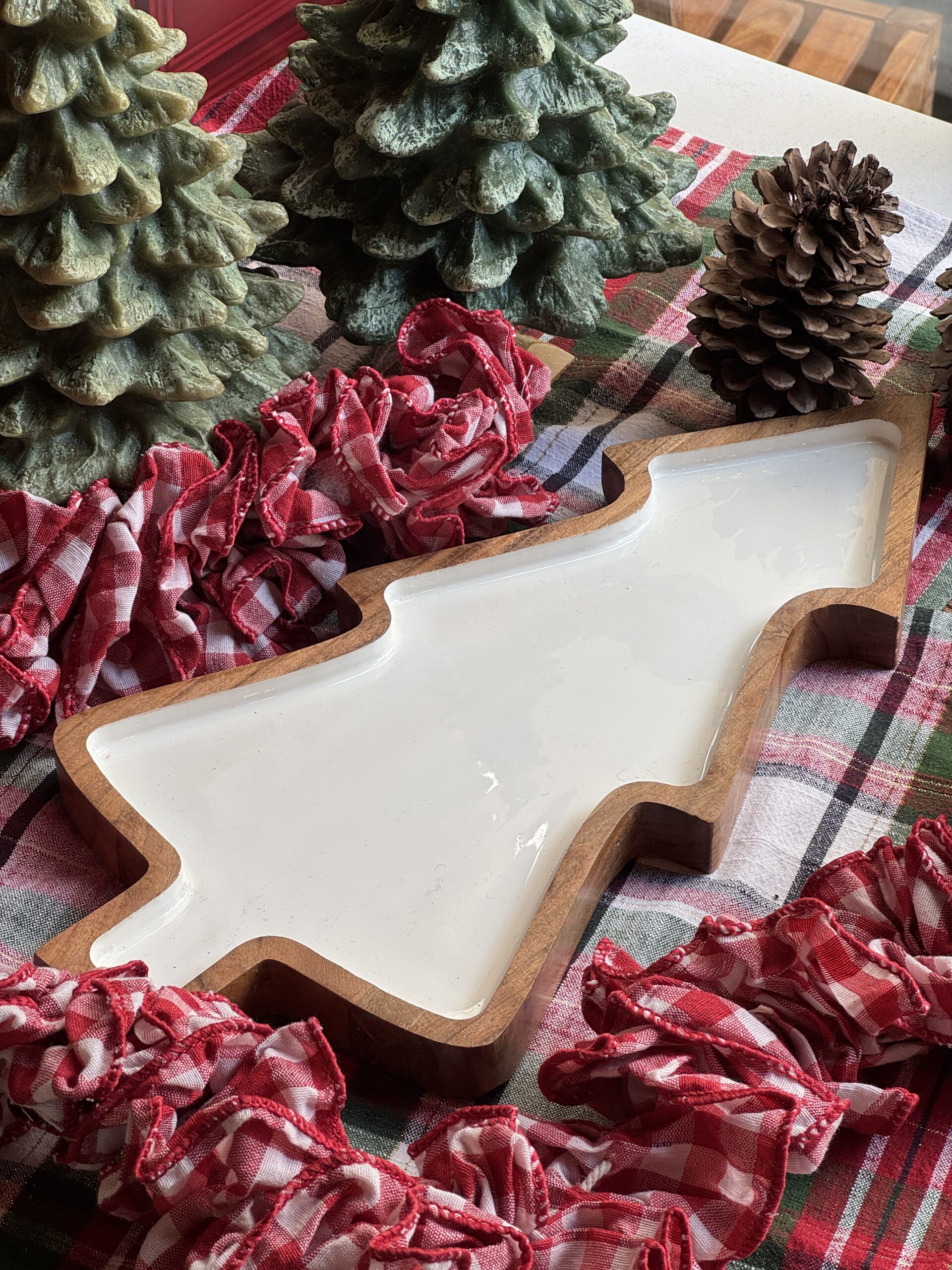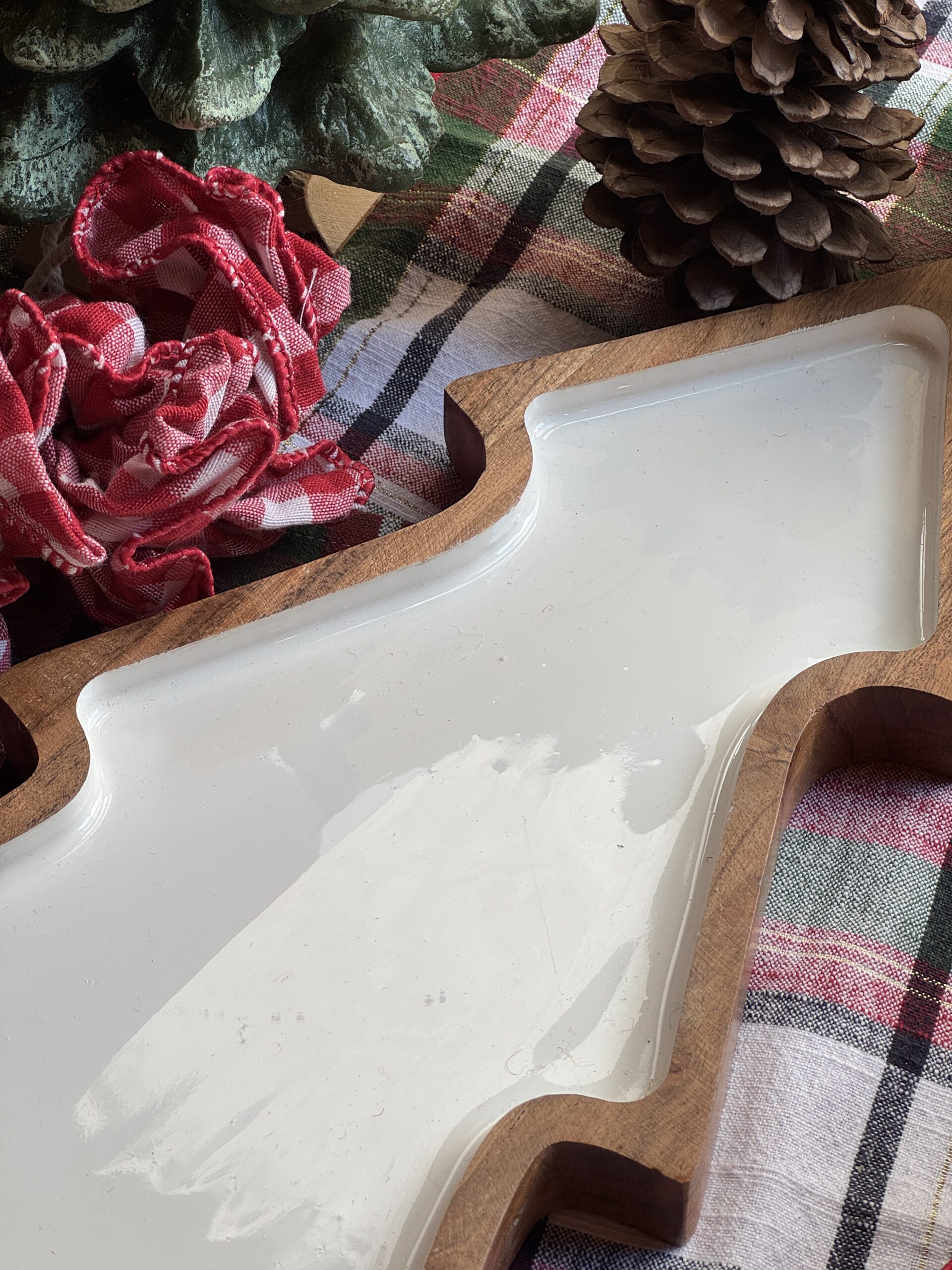 Botanero de madera con forma de árbol de navidad y laca blanca.