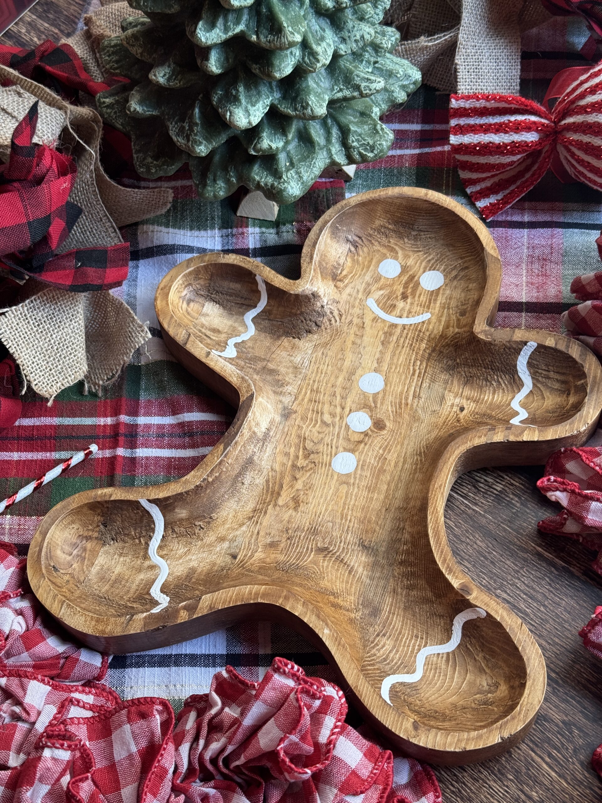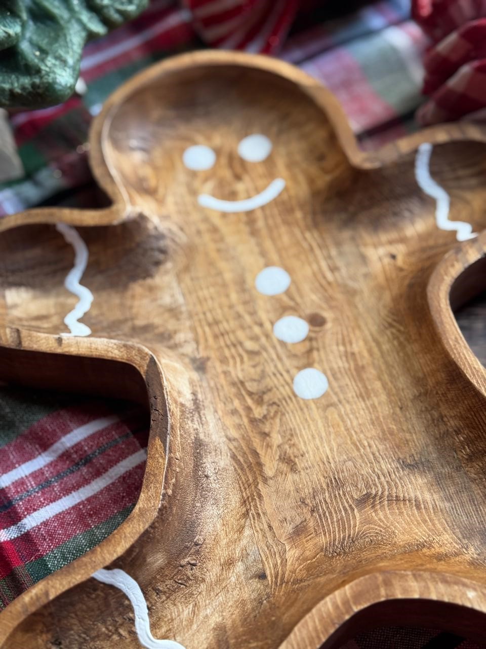 Botanero de madera en forma de muñeco de jengibre.