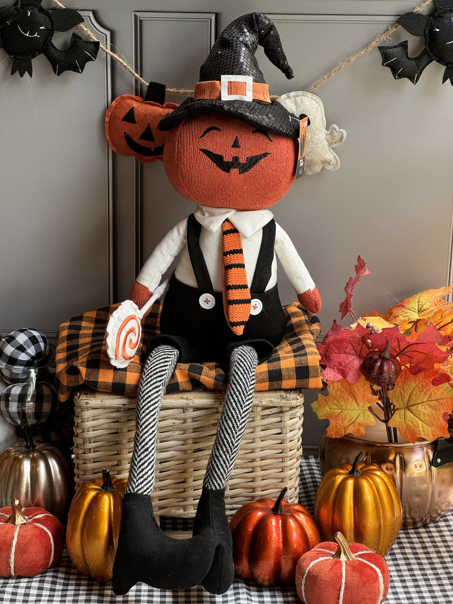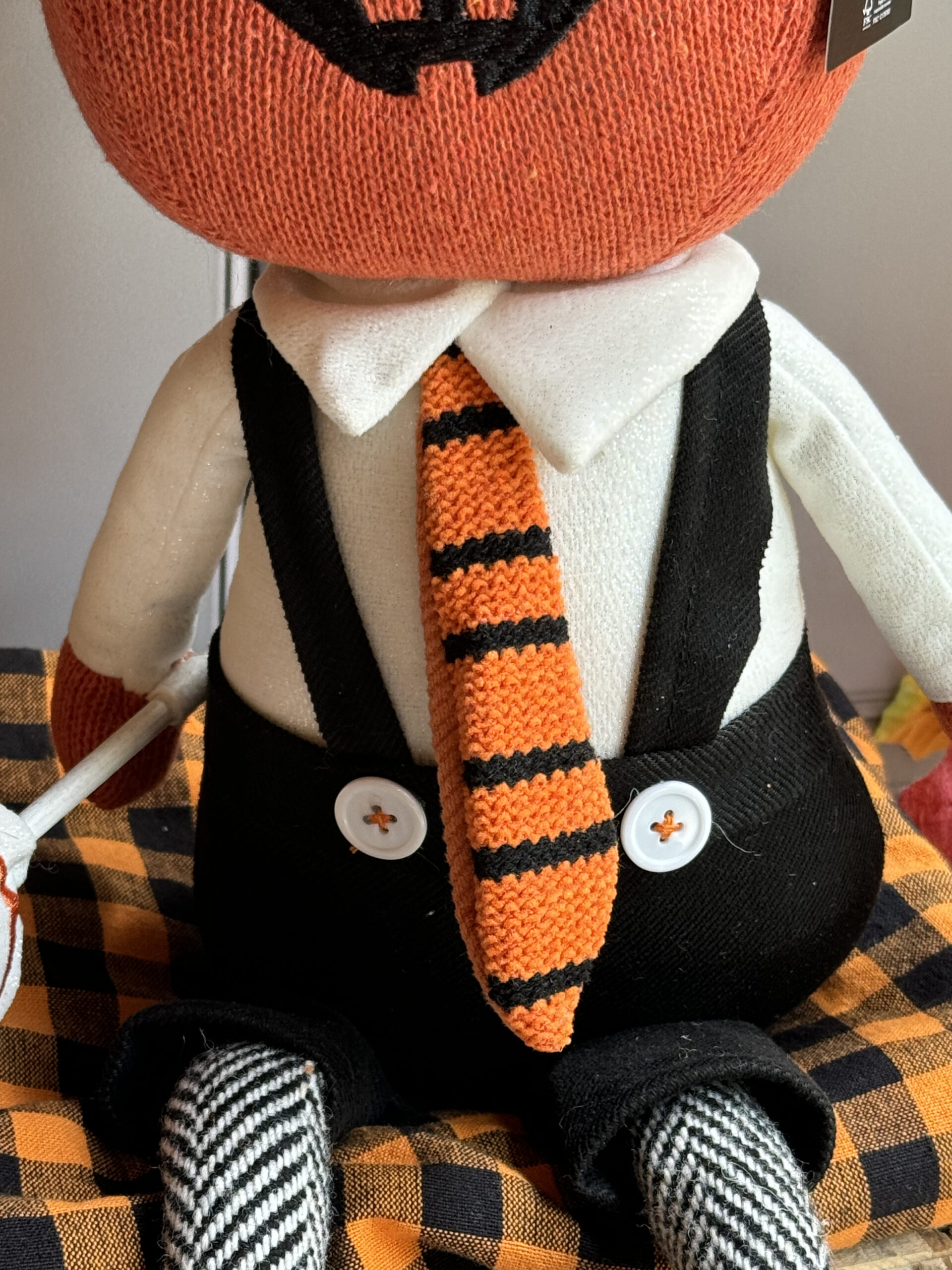 Muñeco de calabacita con shorts, tirantes y paleta en mano.