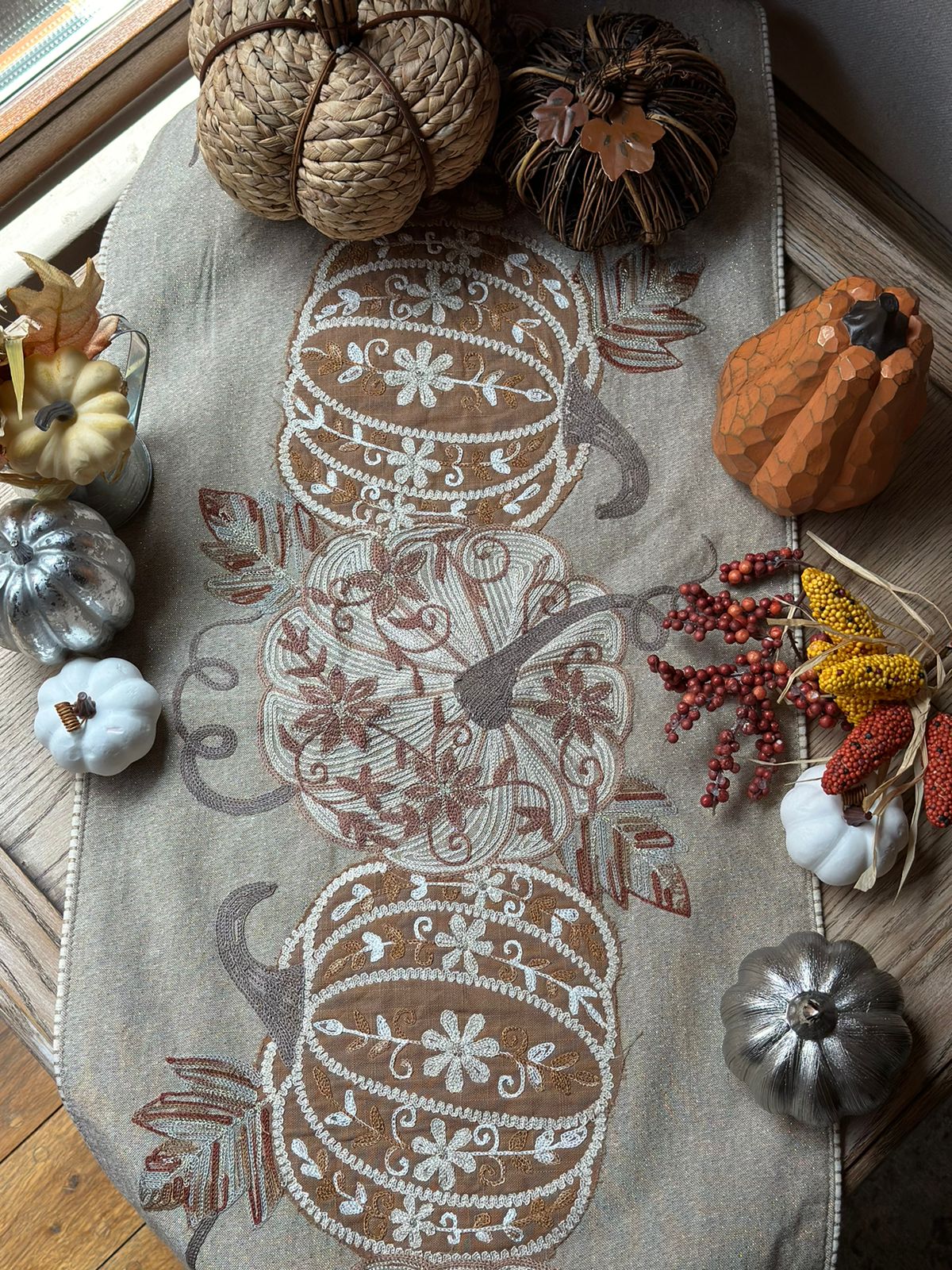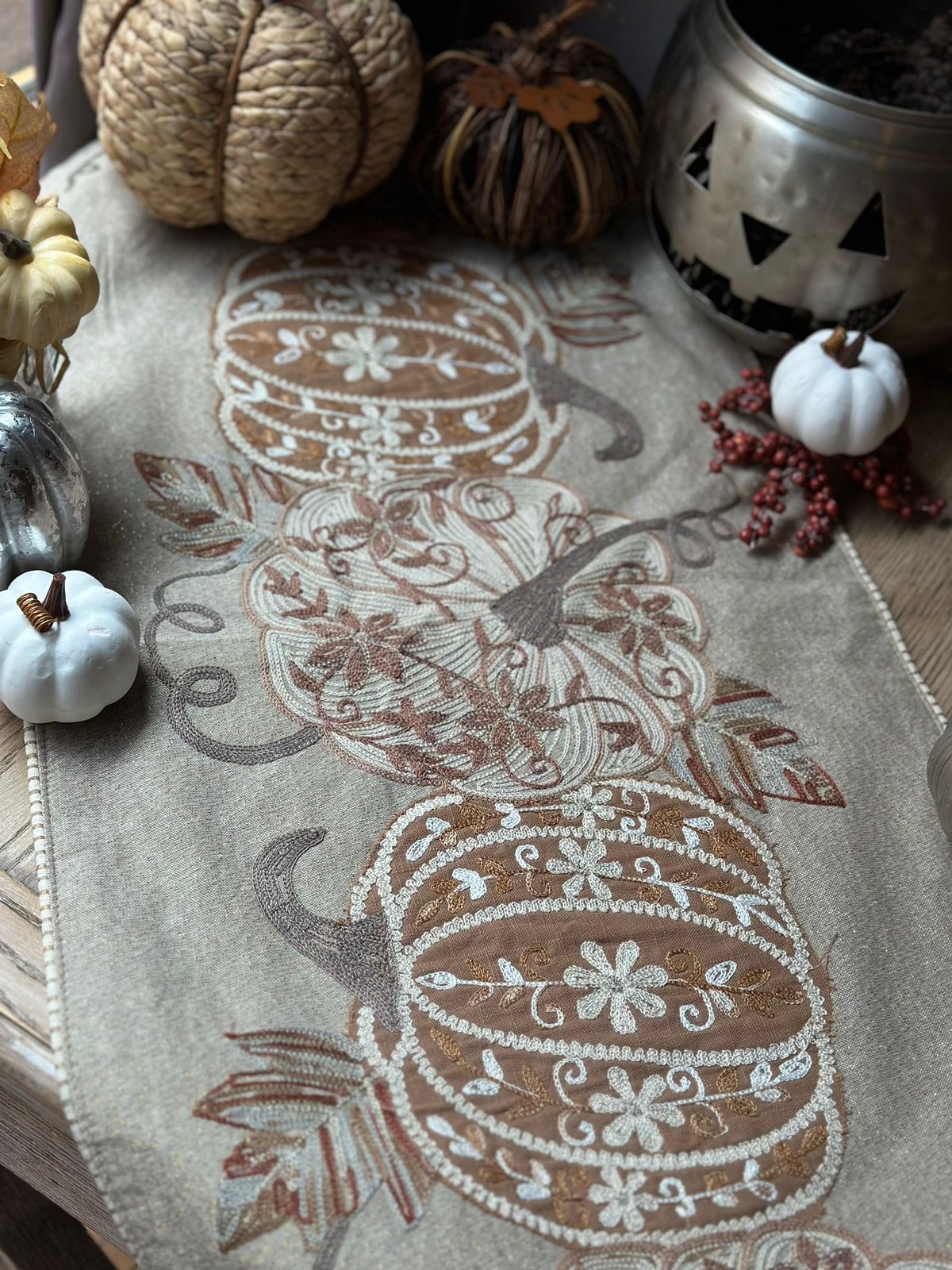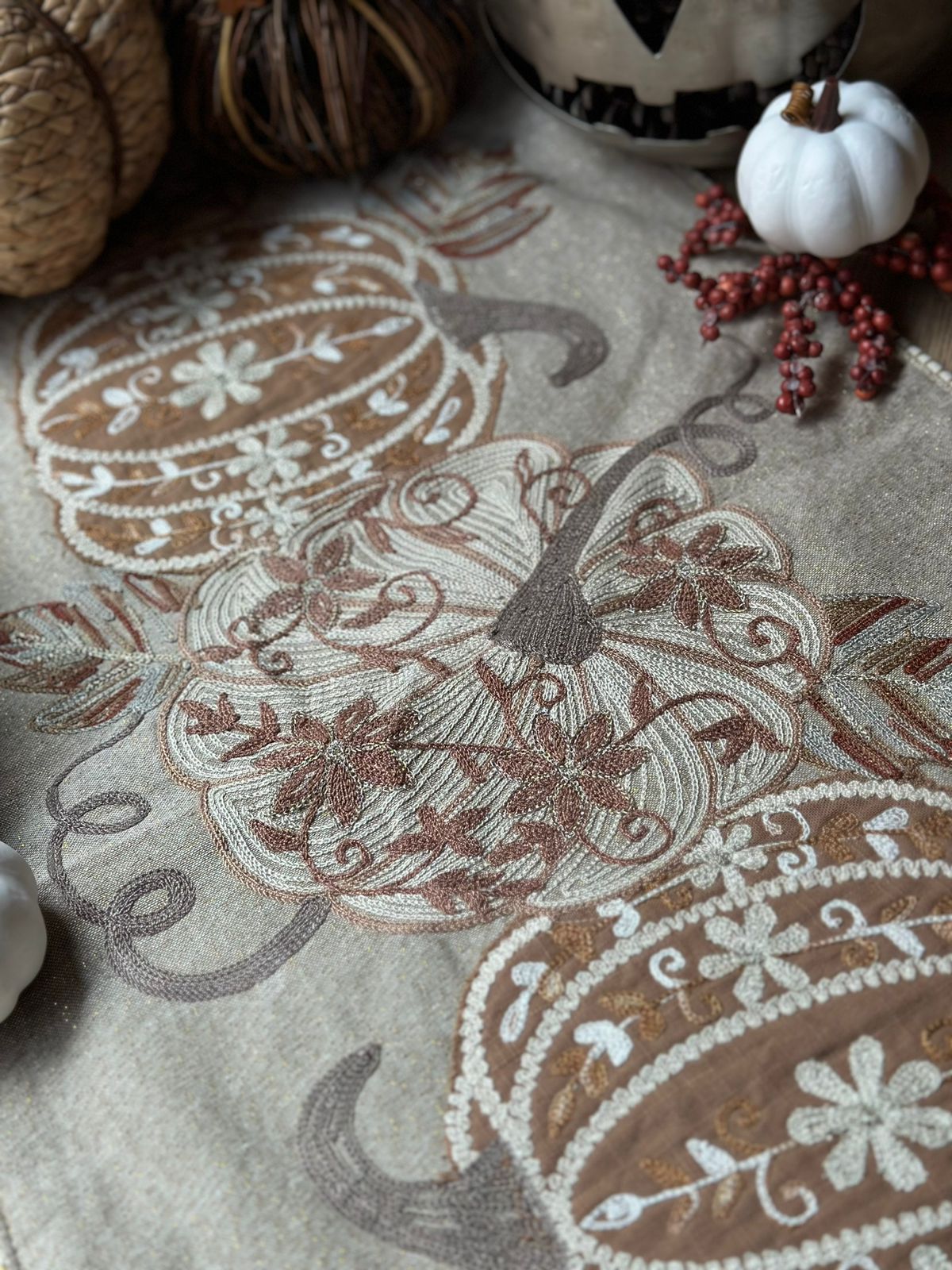 Camino de mesa en tonos beige bordado con calabazas.