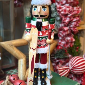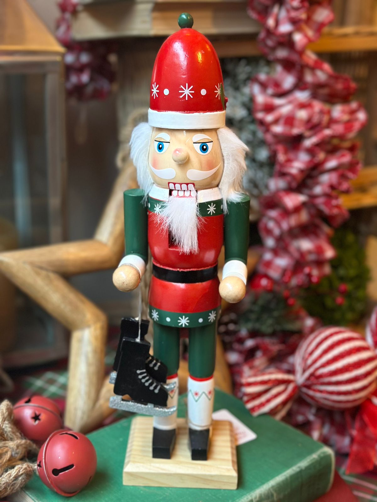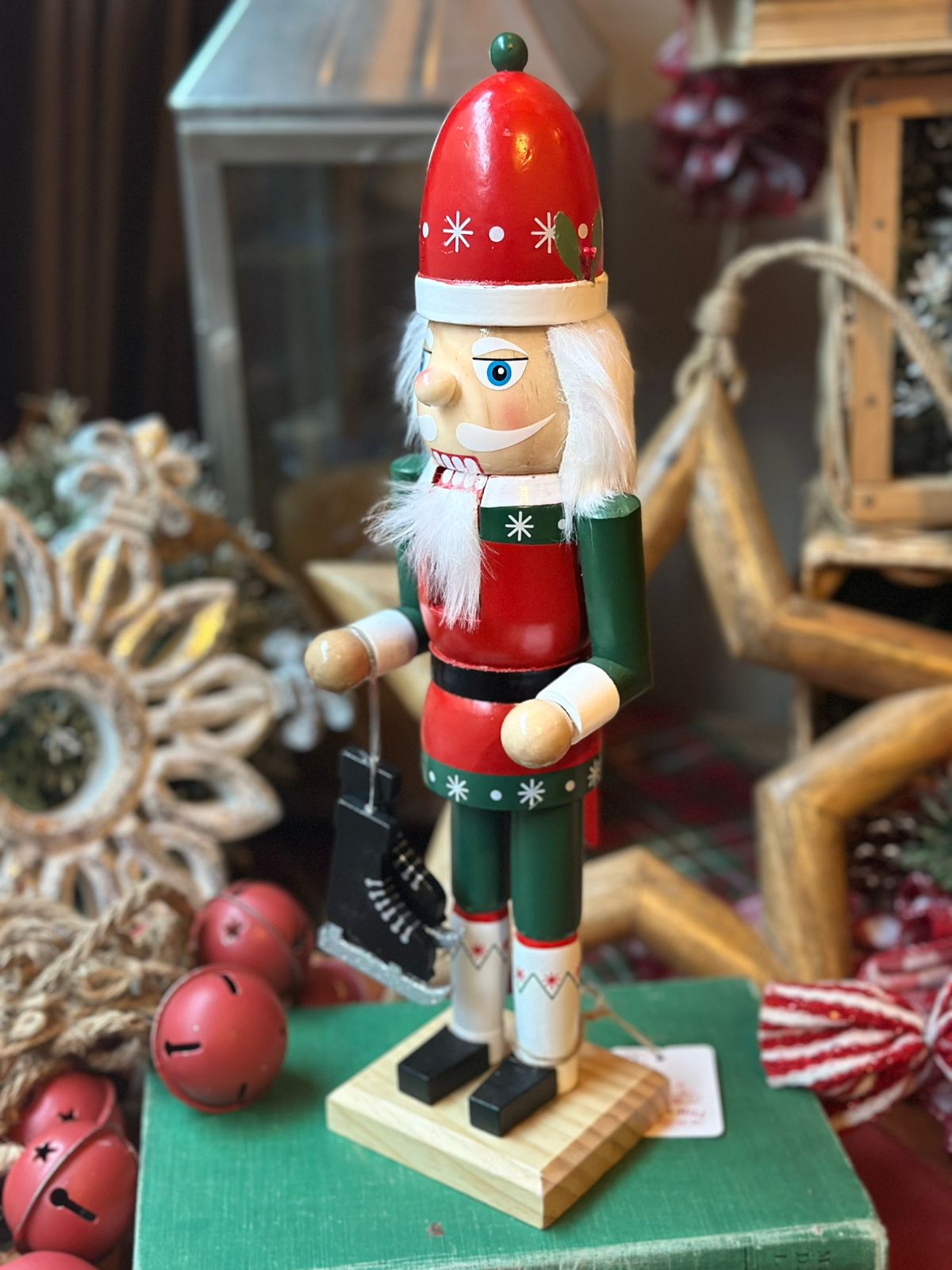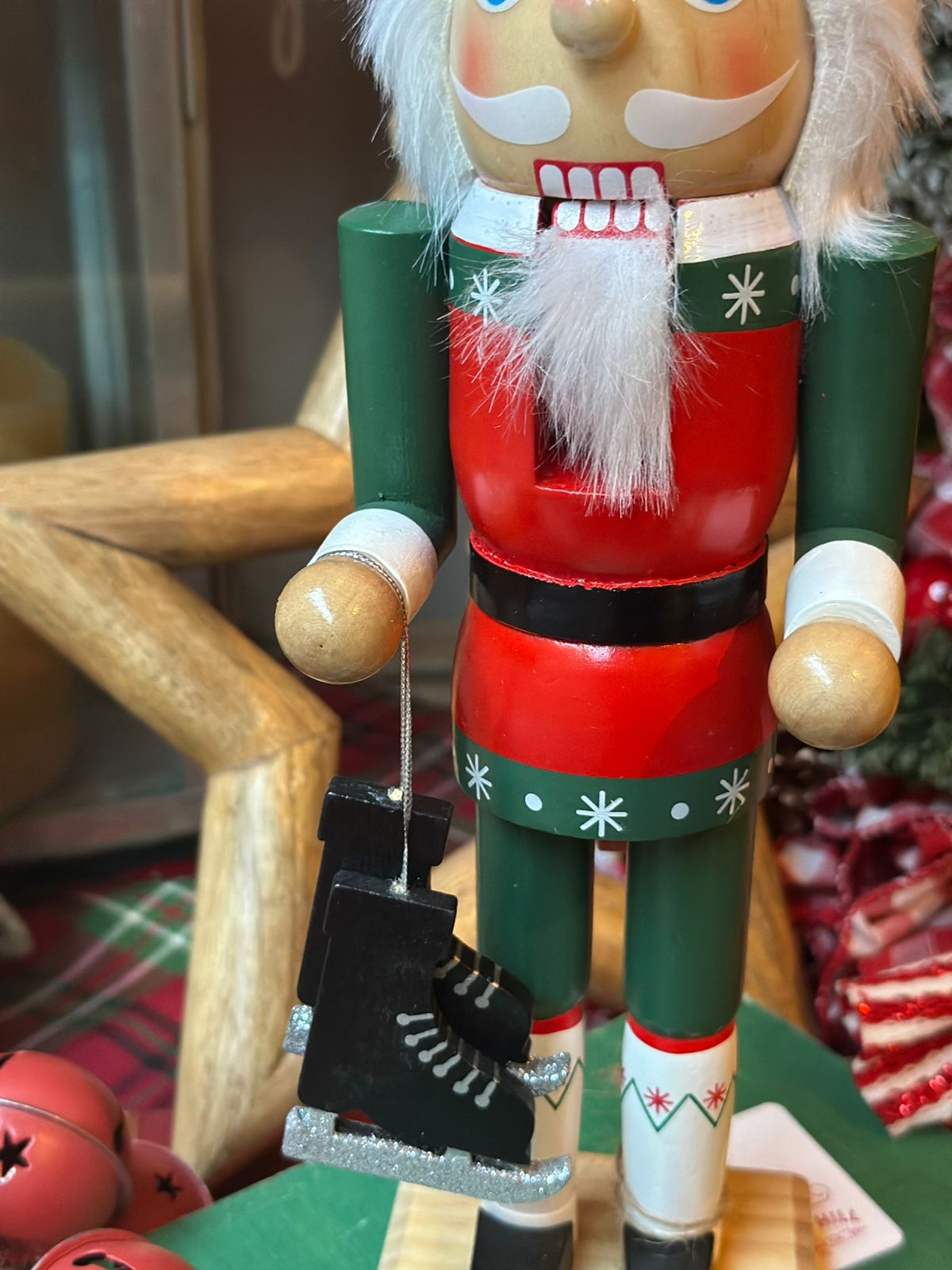 Cascanueces de madera con motivos rojos y verdes y patines de hielo.