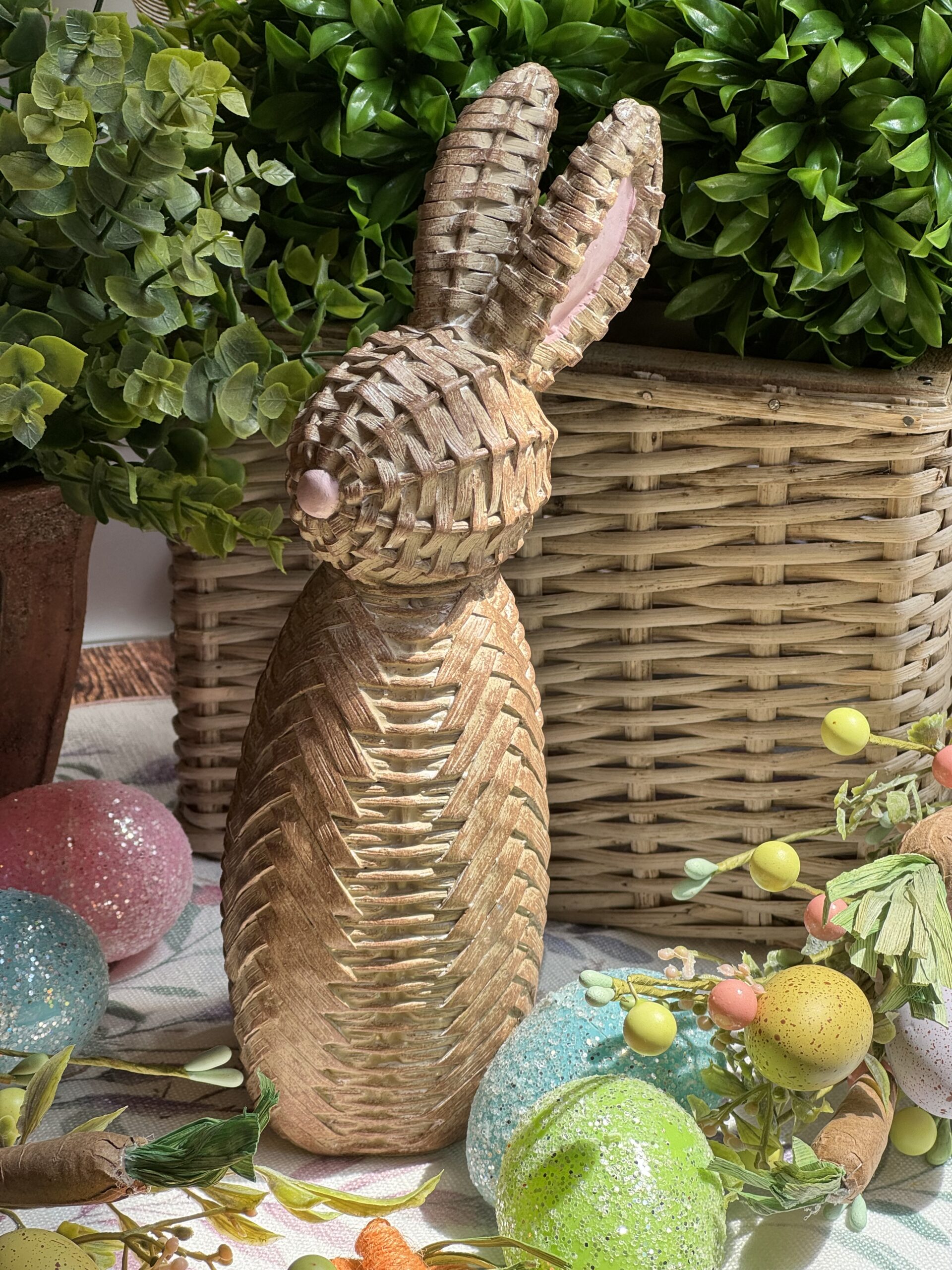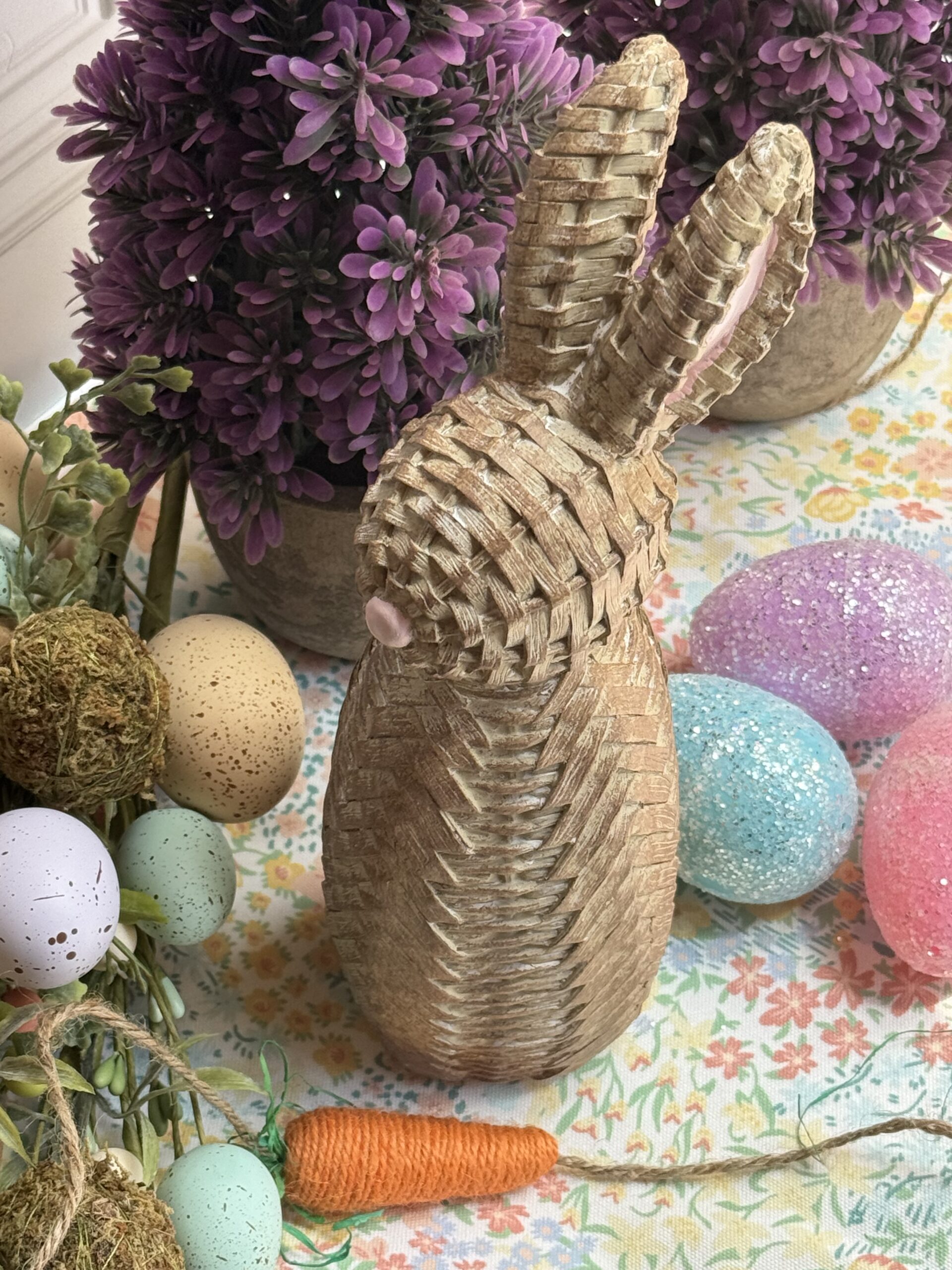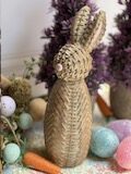 Figura de conejo con acabado tipo tejido y nariz rosita.