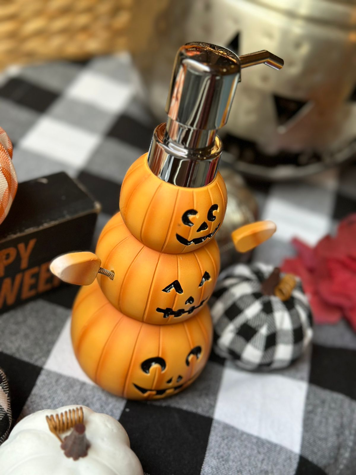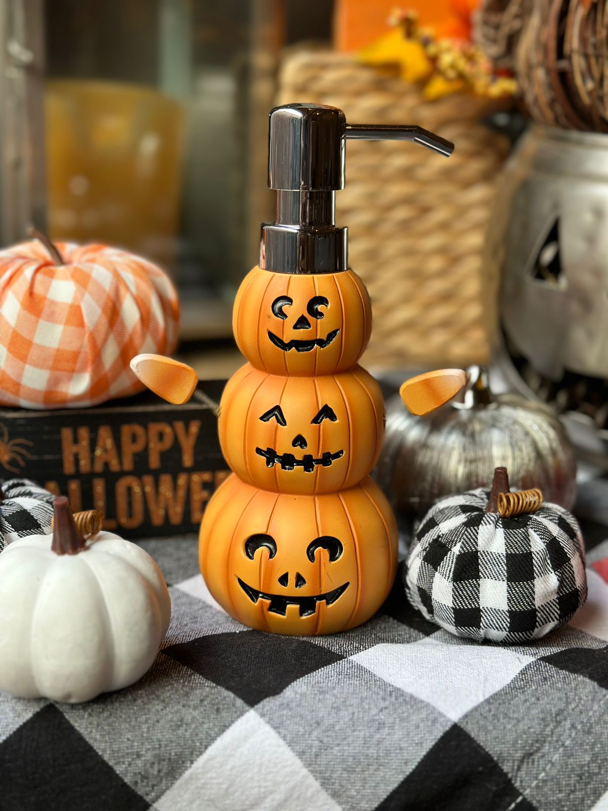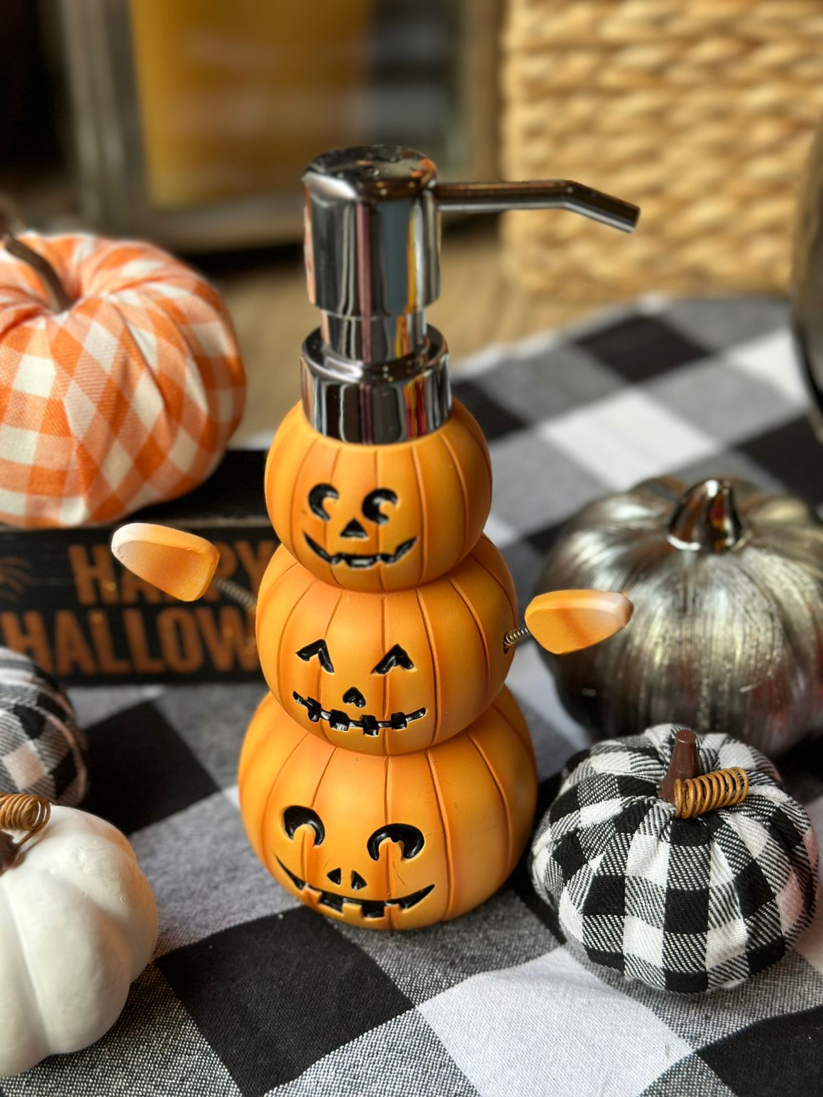 Despachador de jabón con forma de 3 calabazas con bracitos de resorte candycorn.