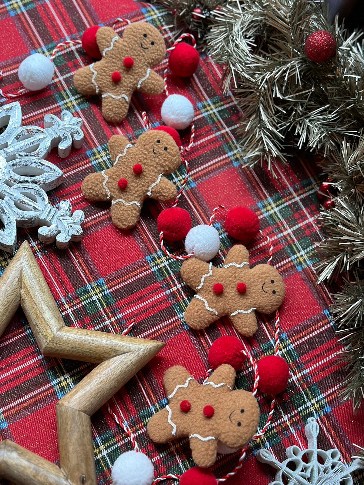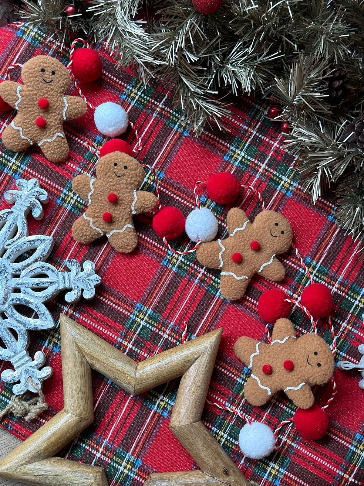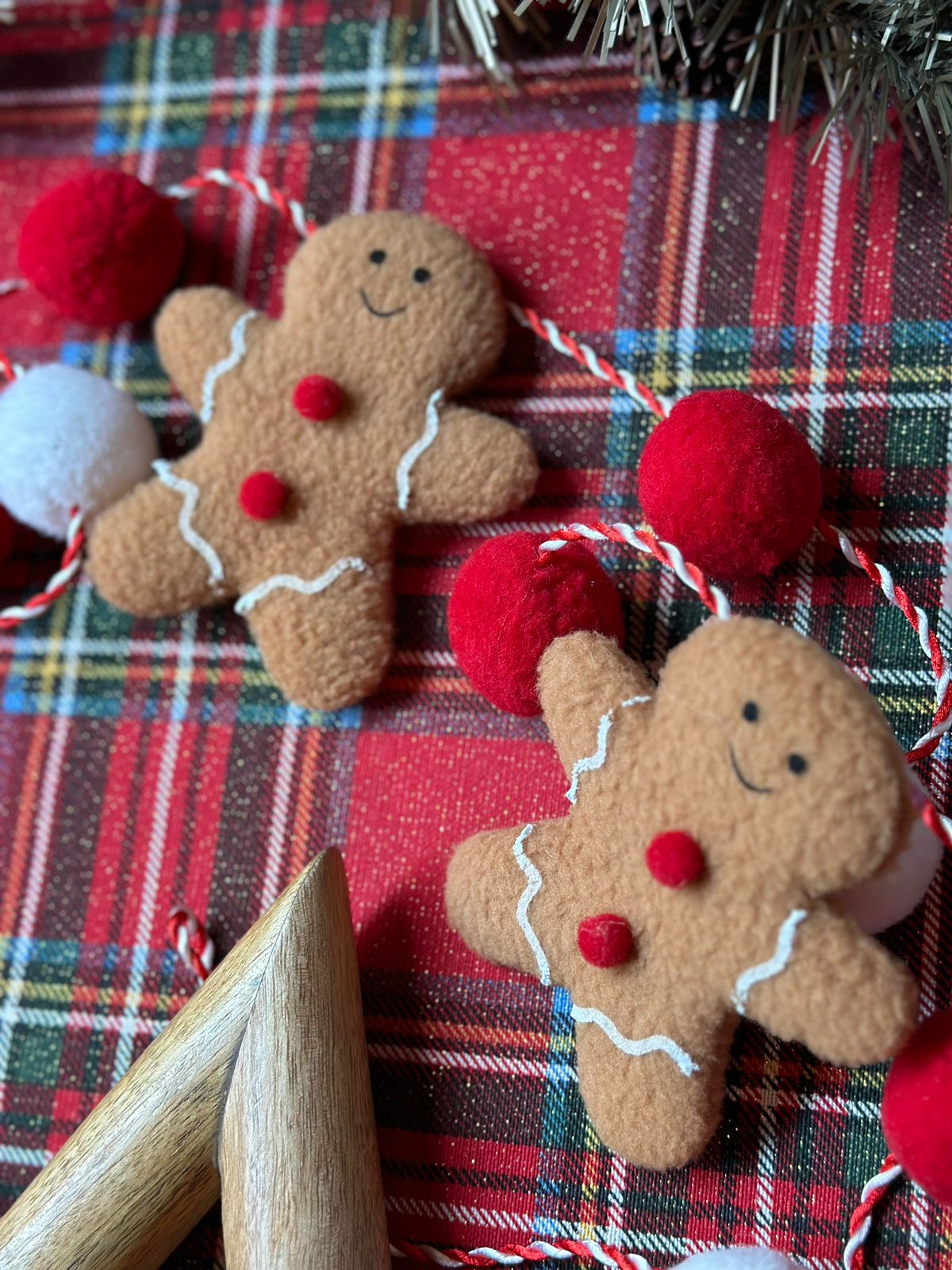 Guirnalda con diseño de galletas de jengibre con pompones intercalados.