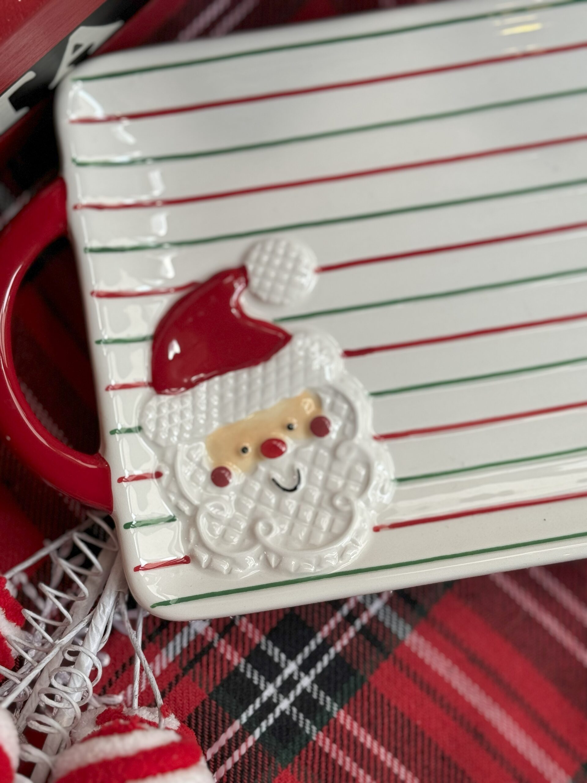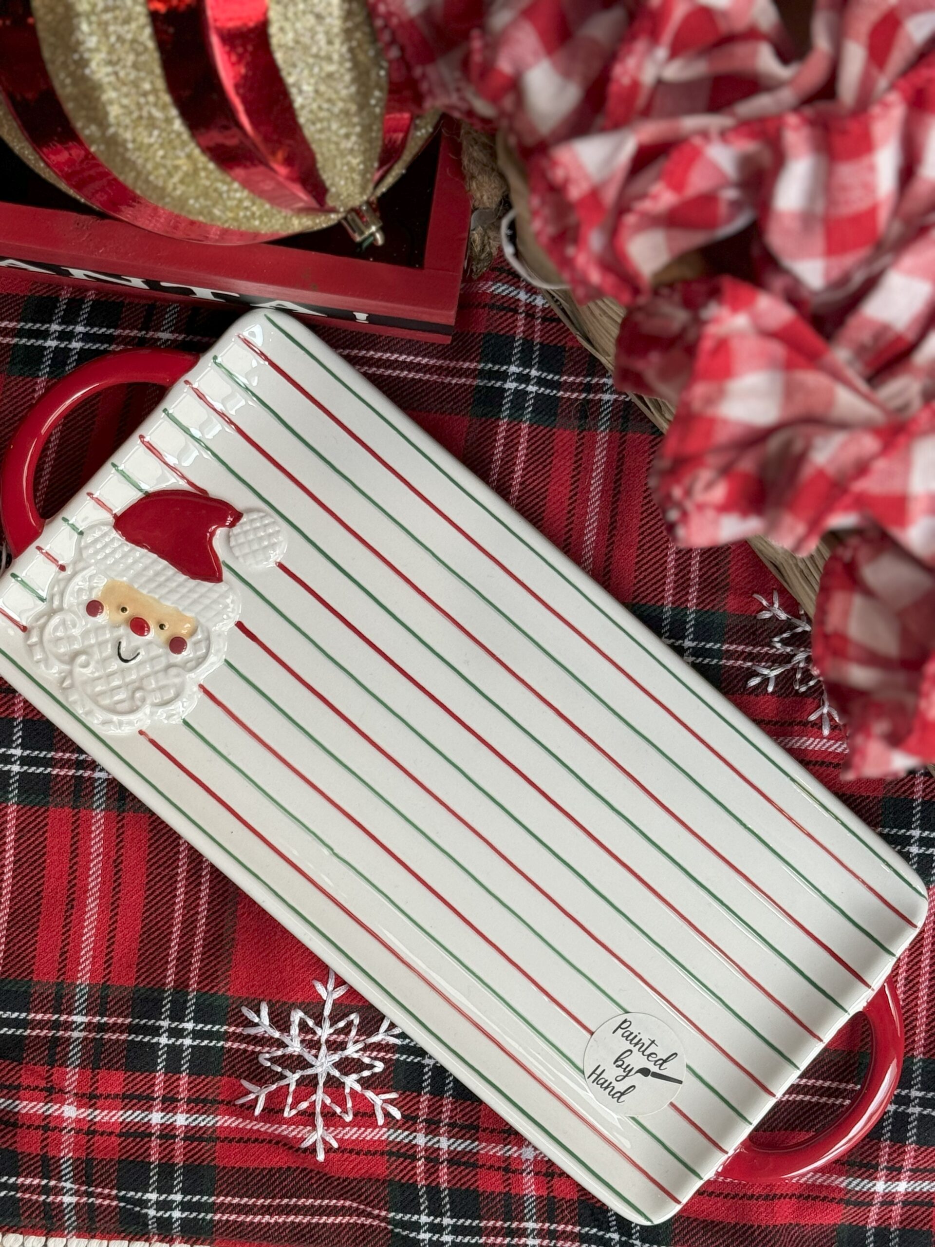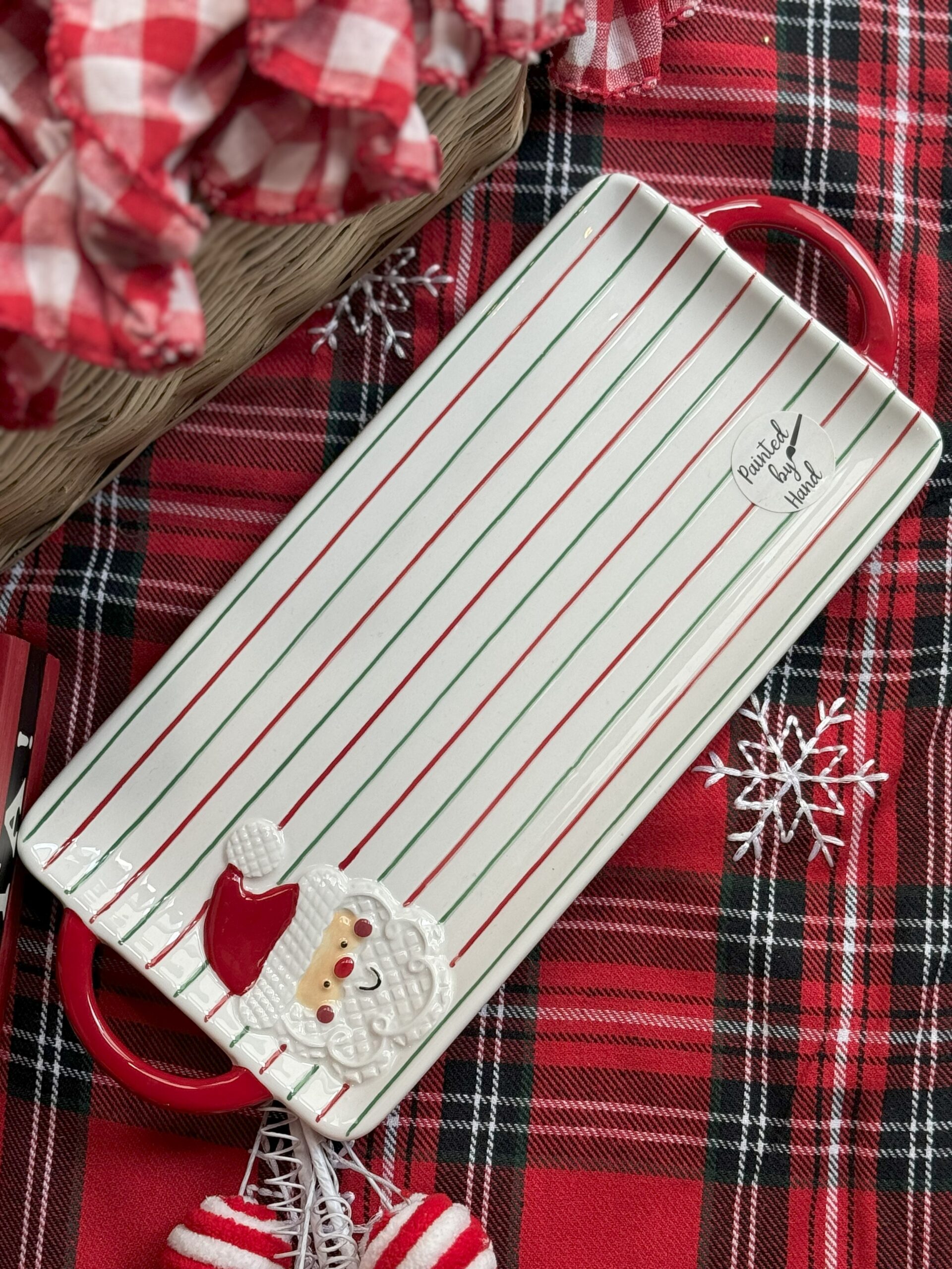 Plato rectangular de cerámica con rayas y figura de santa.