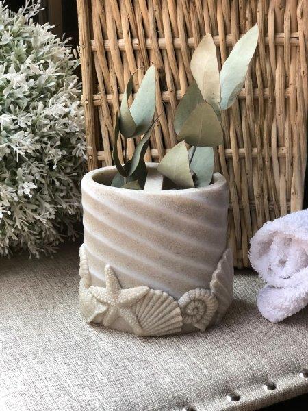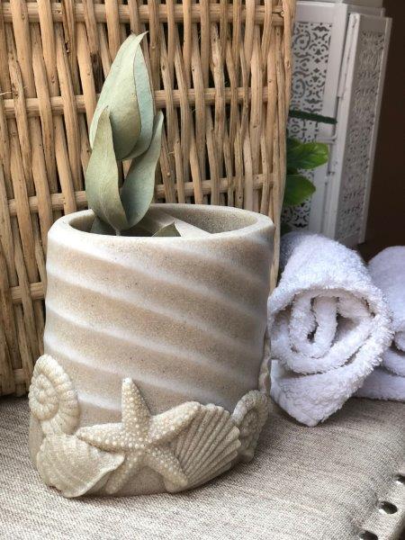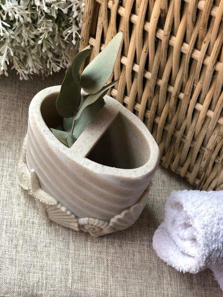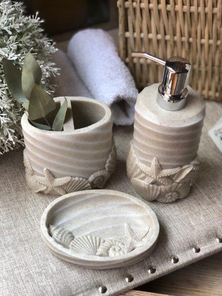 Portacepillos con textura de conchas. Busca el despachador y la jabonera a juego.