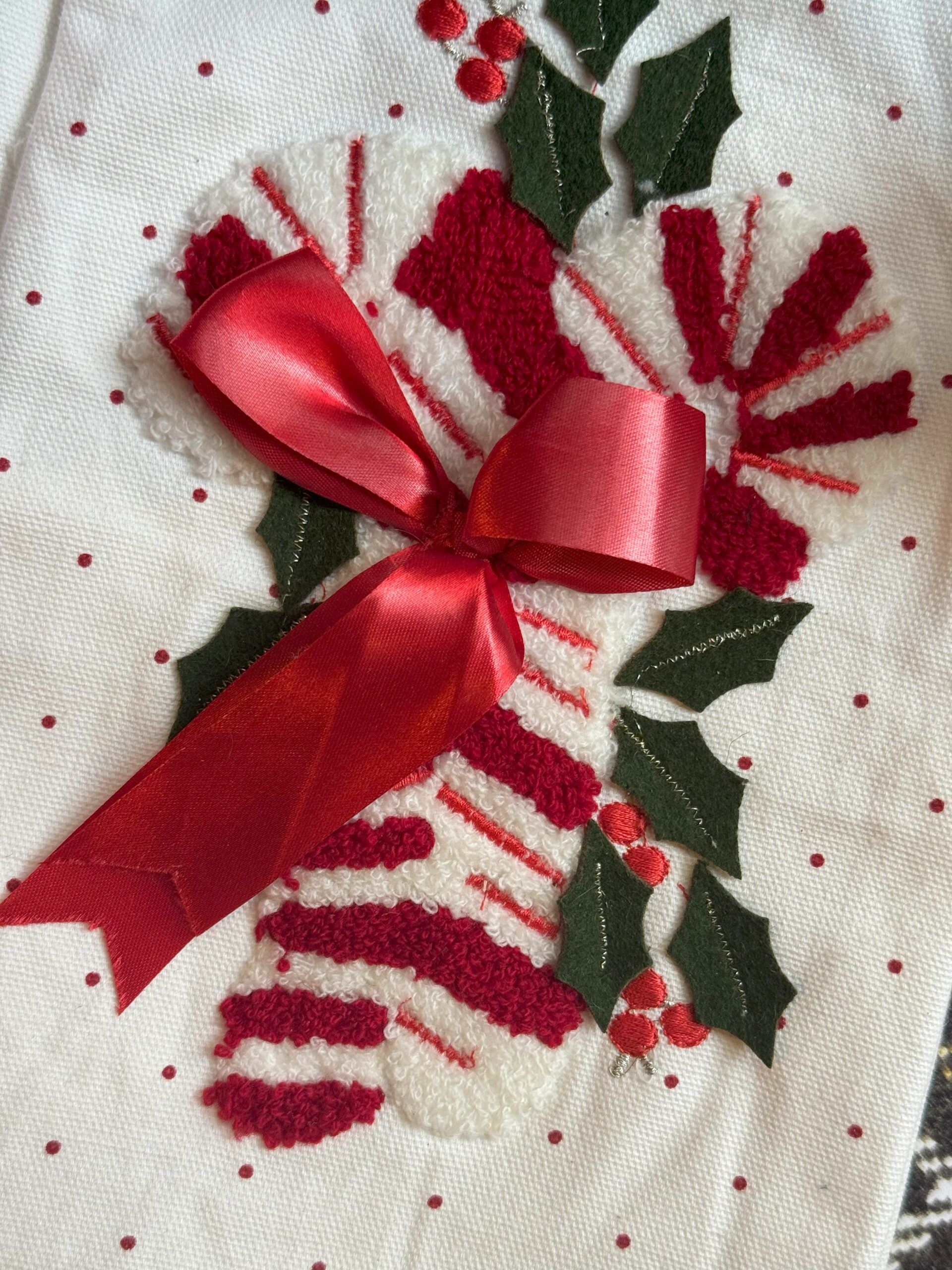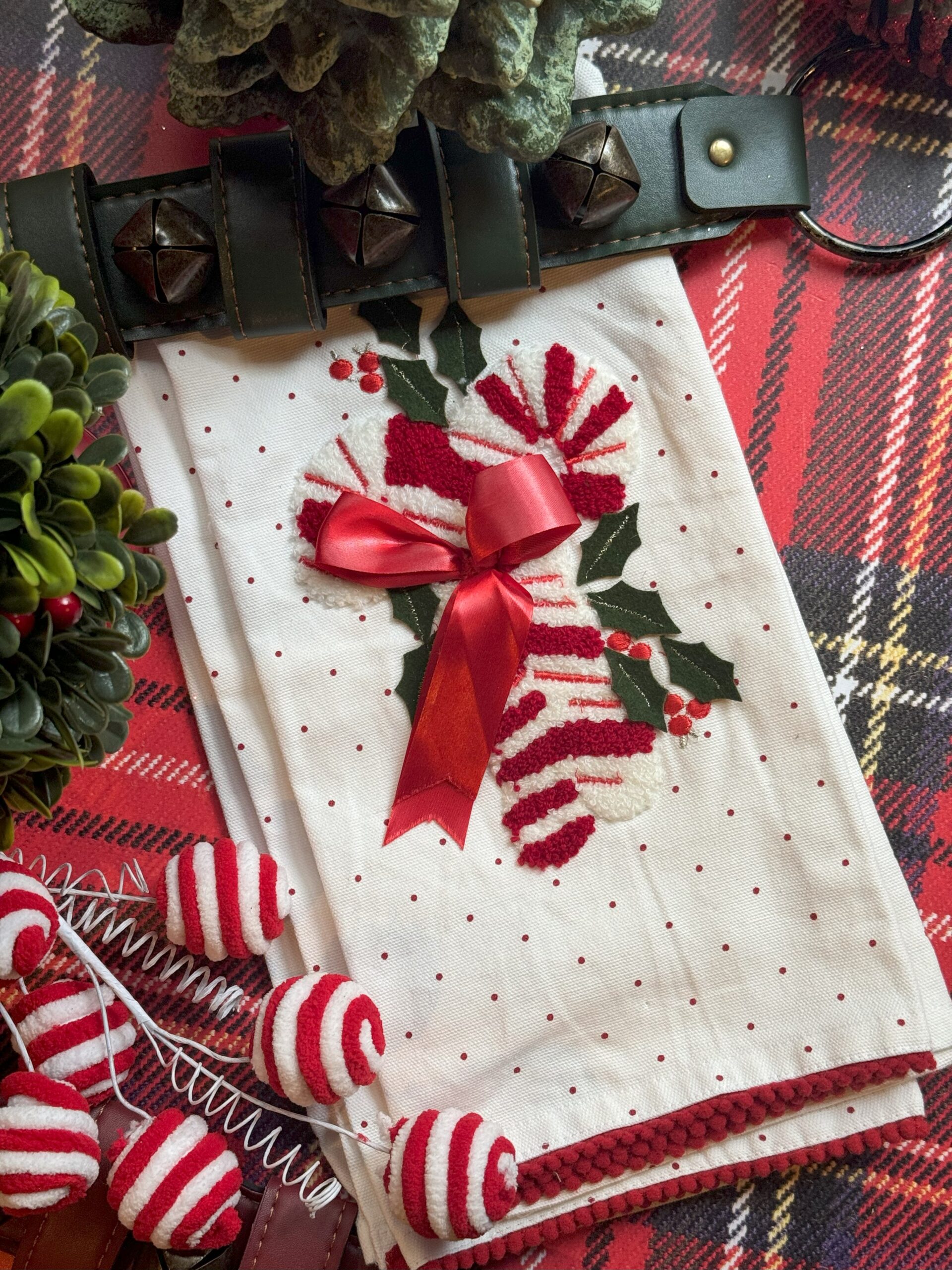 Set de 2 toallas de cocina con camdy cane bordado y listón.
