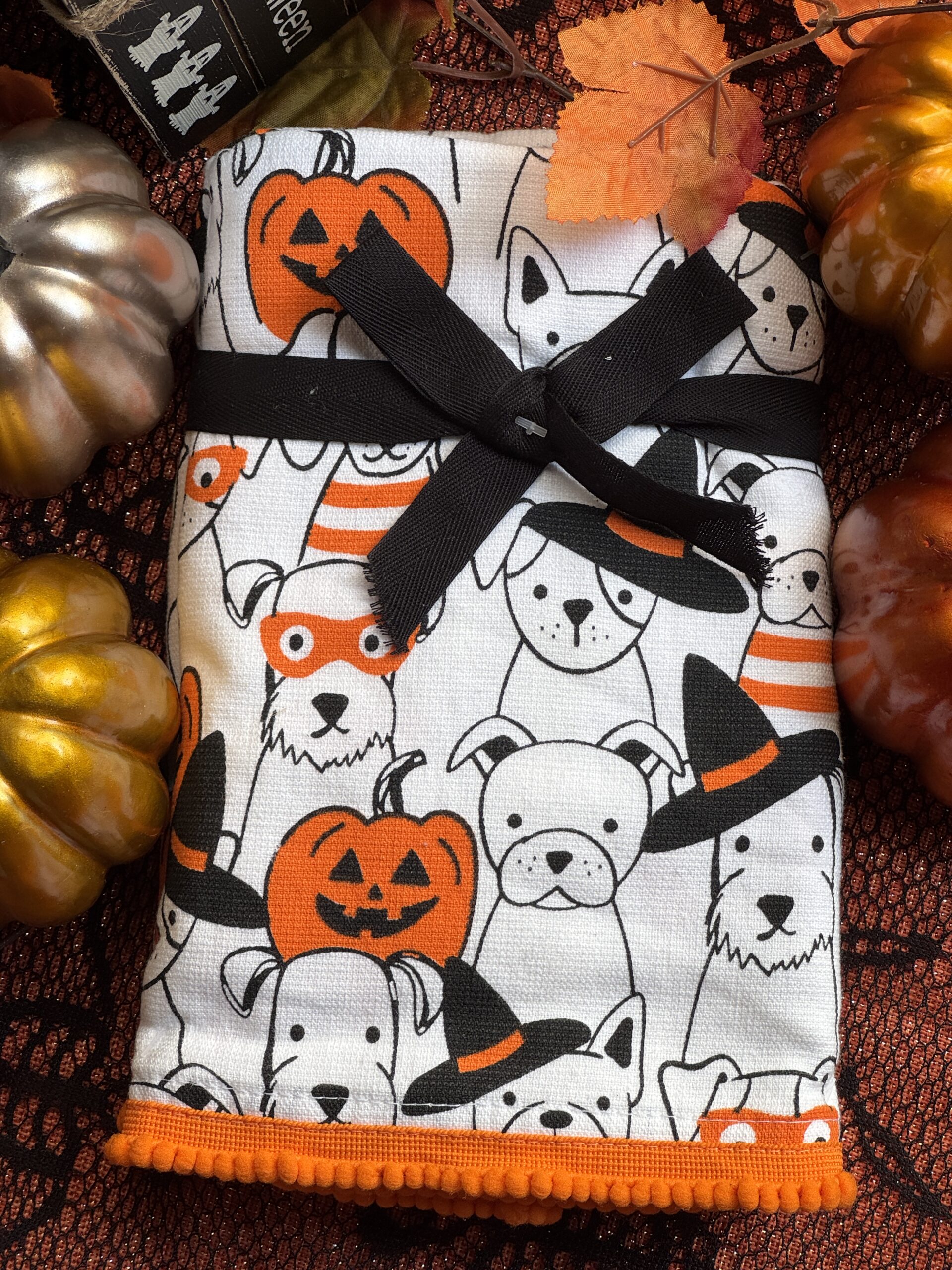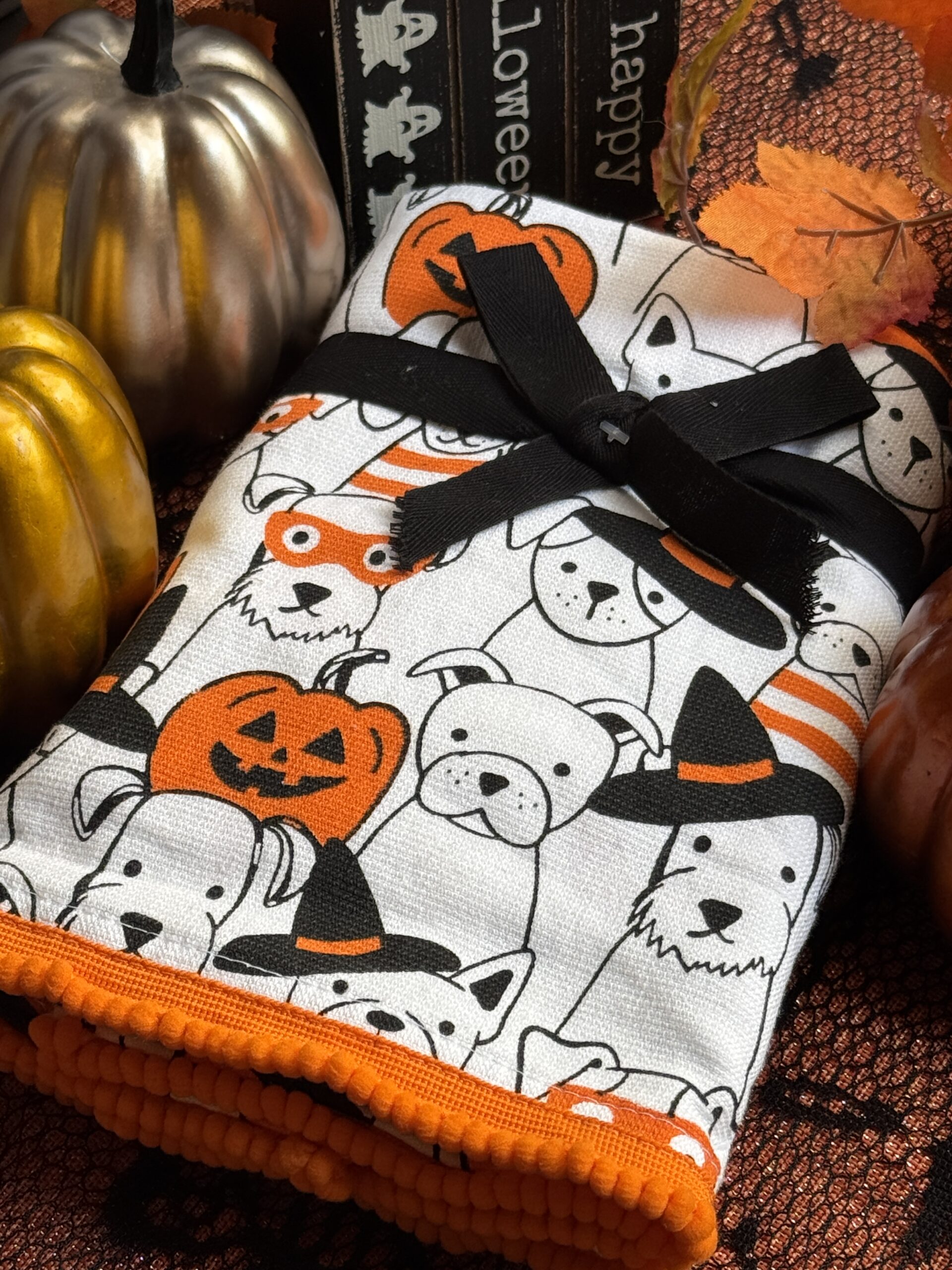Set de 2 toallas de manos con perritos disfrazados de halloween.