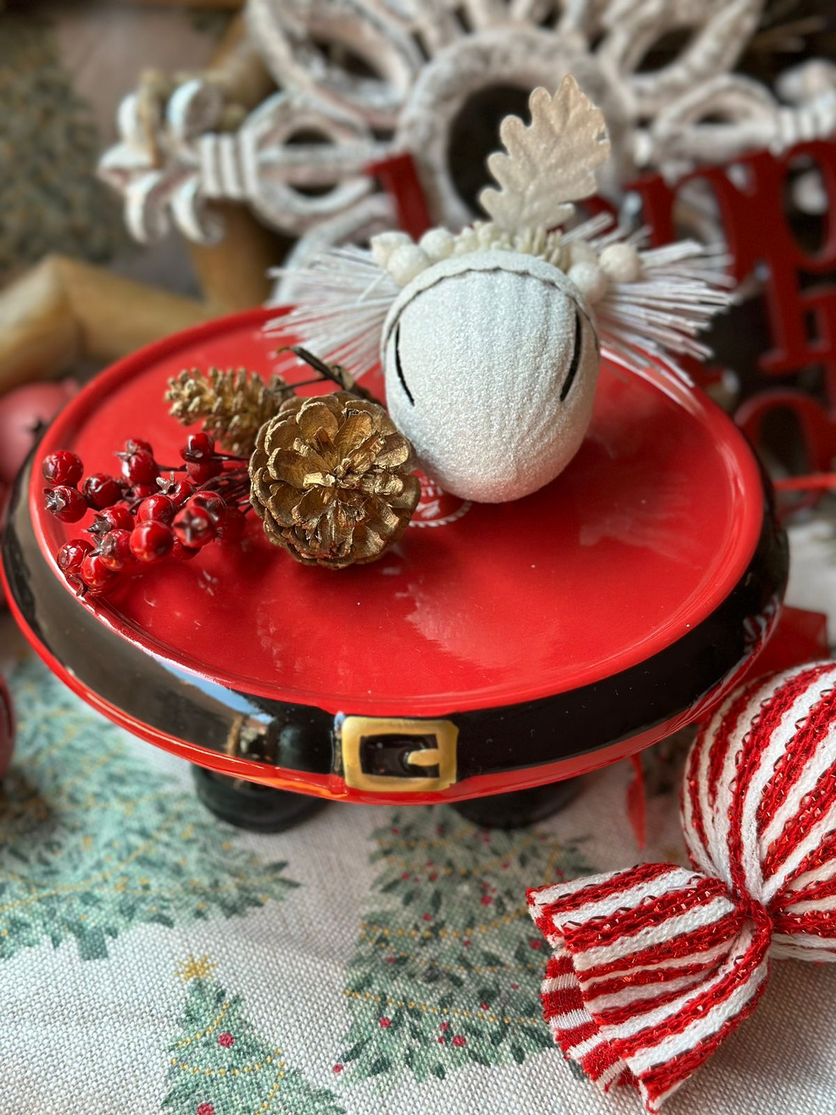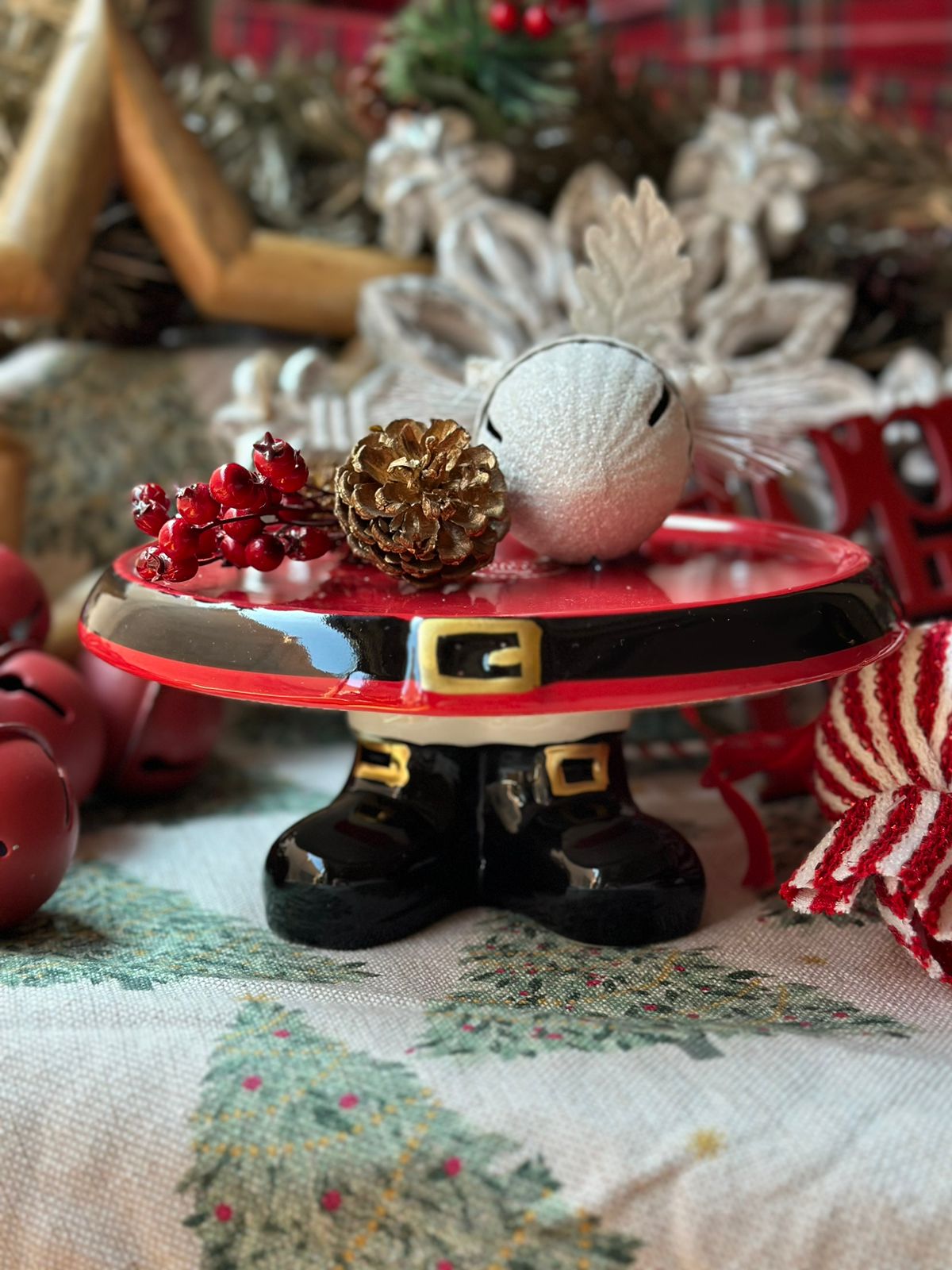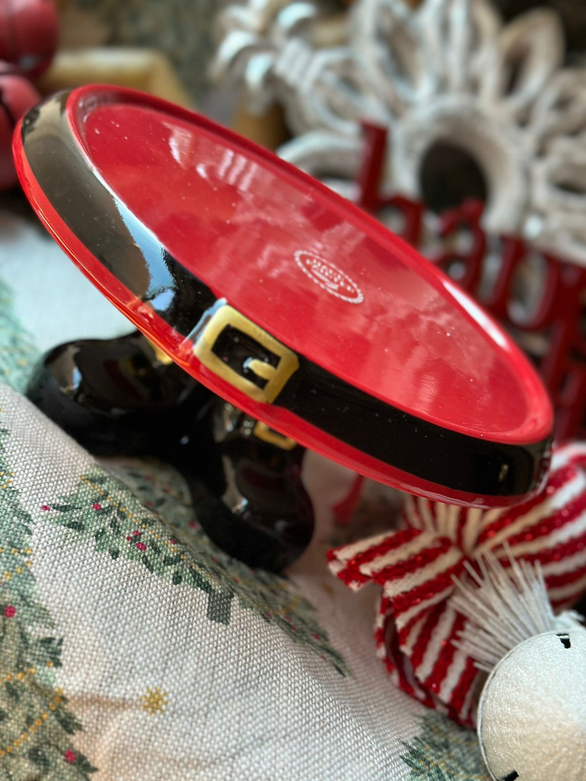 Cake stand de cerámica con forma de cinturón y botas de Santa Claus.