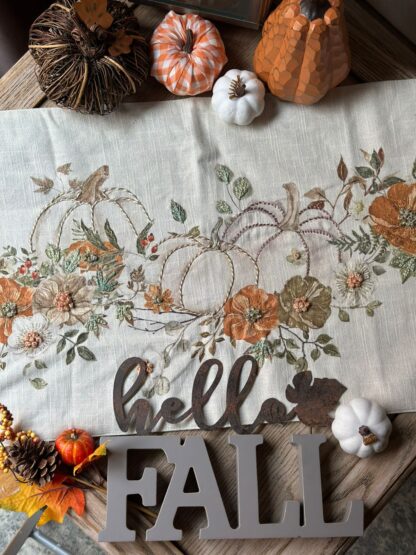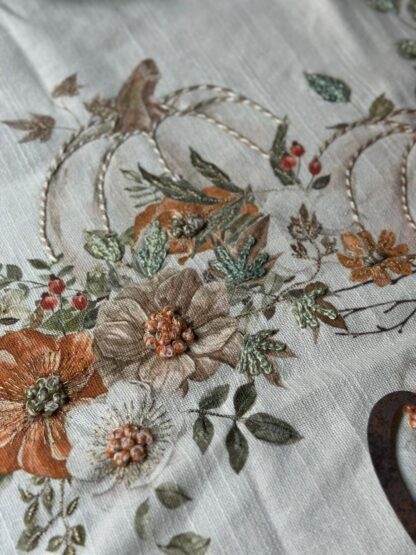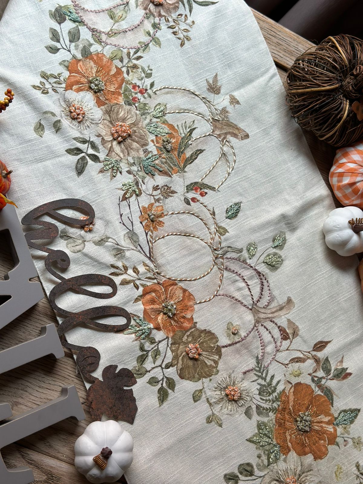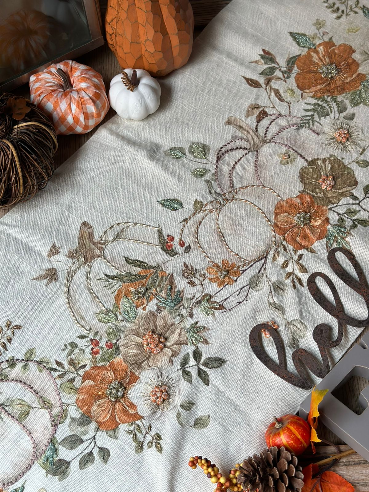 Camino de mesa con diseño de calabazas con aplicaciones beige.