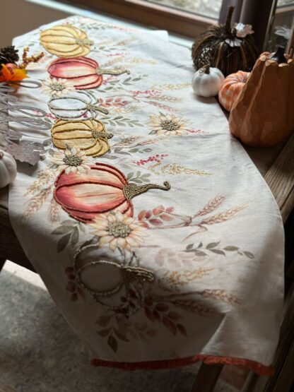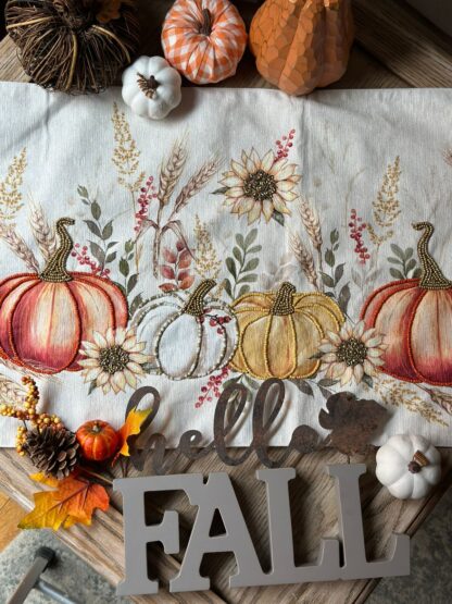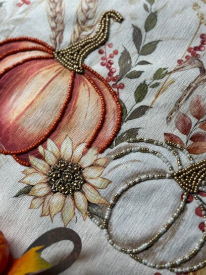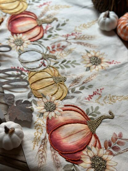 Camino de mesa con diseño de calabazas naranjas con chaquira dorada.