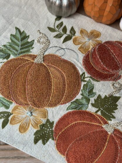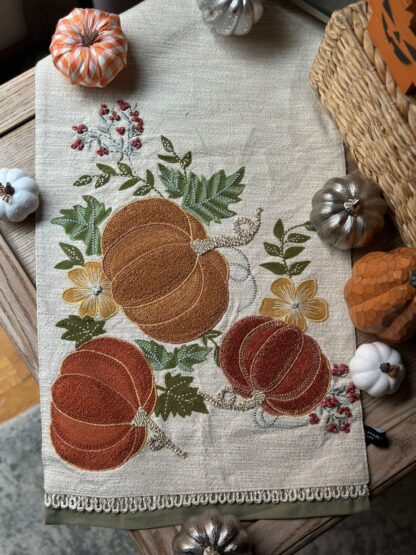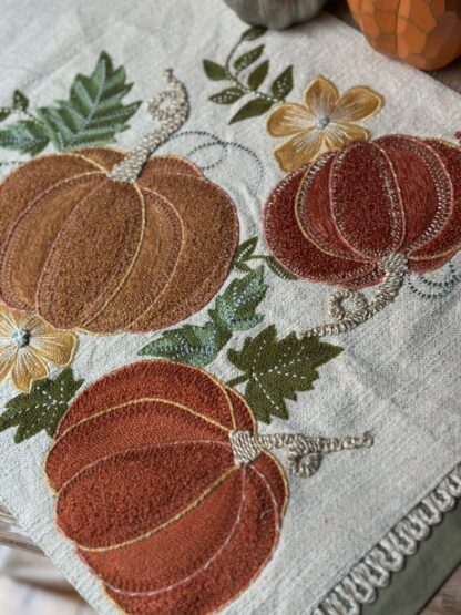 Camino de mesa con diseño de calabazas con hojas de otoño y textura en tela terry.