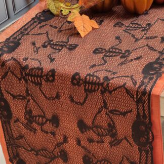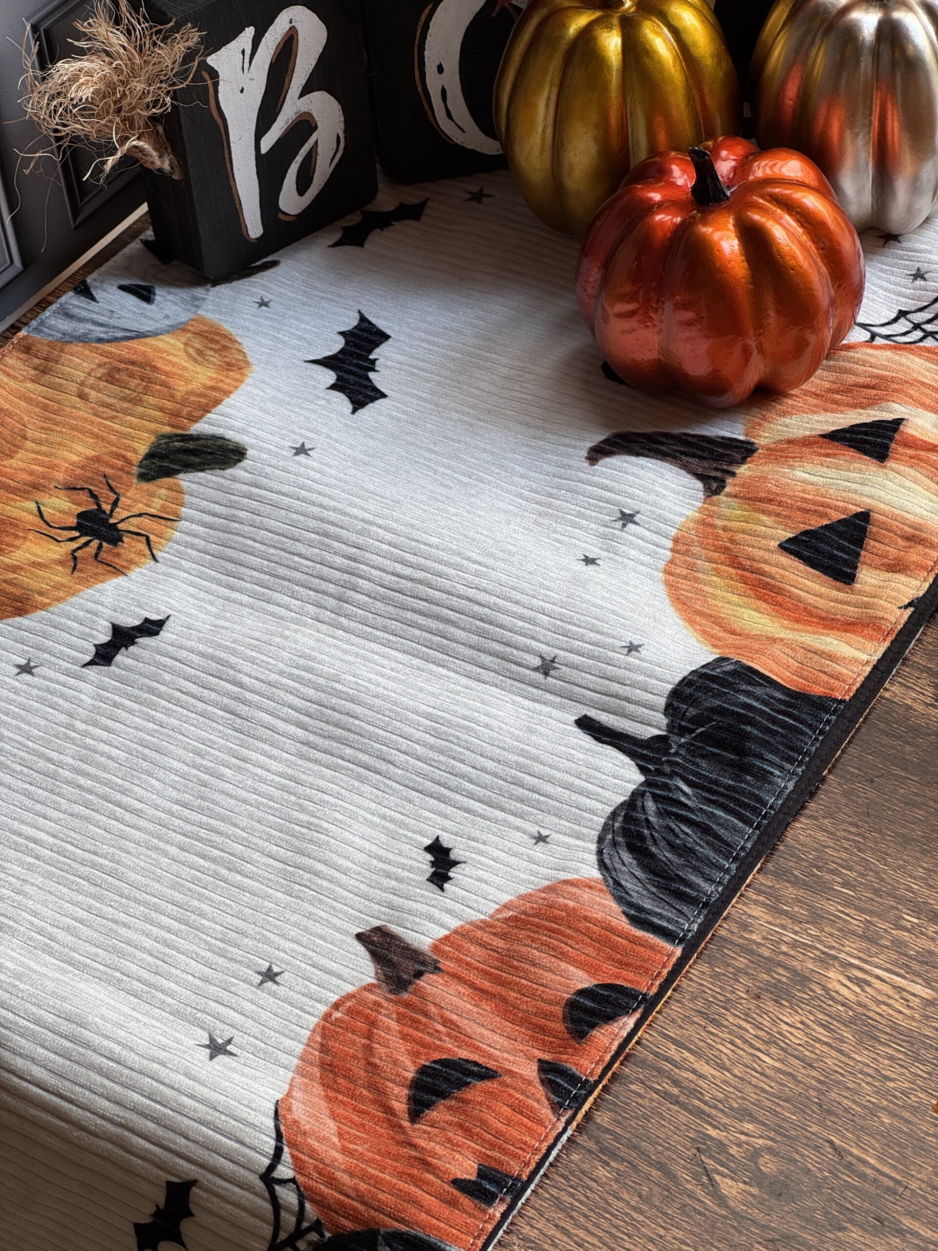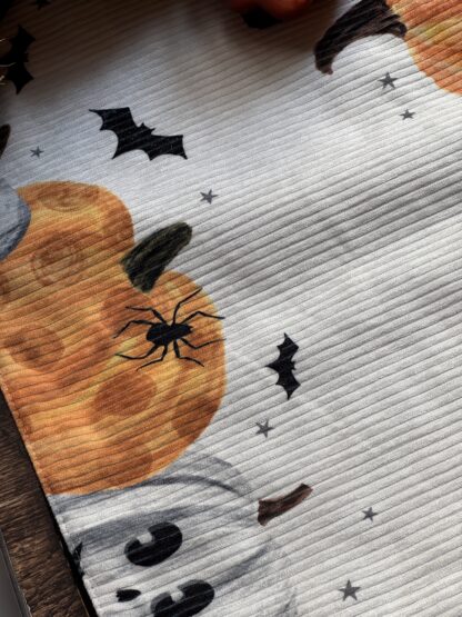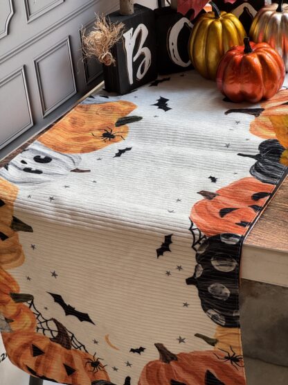 Camino de mesa de calabazas en tonos naranja y blanco y pequeños murciélagos. Textura de pana.