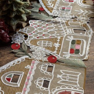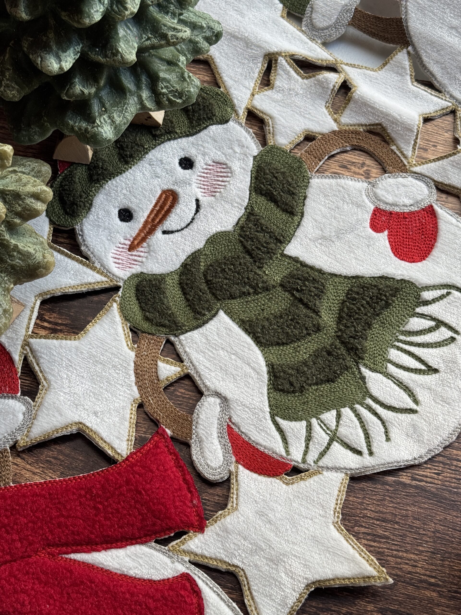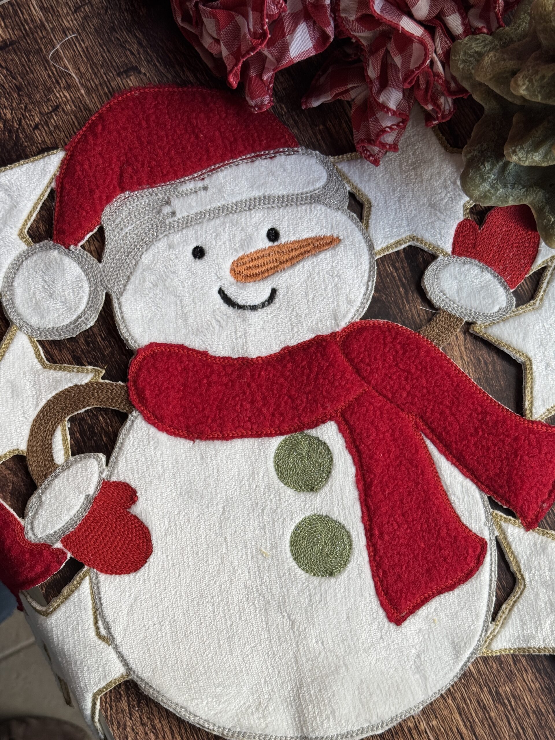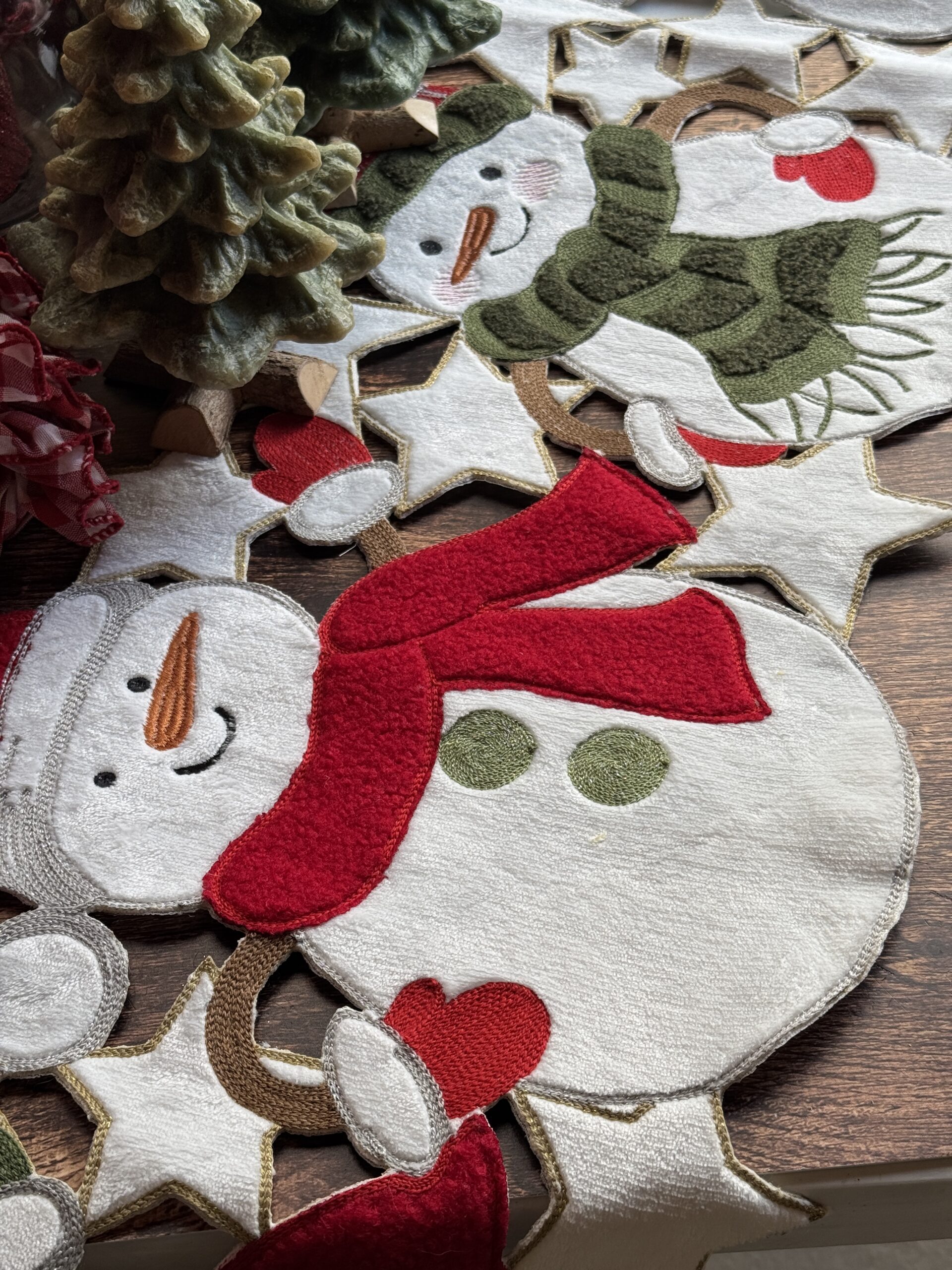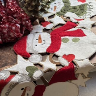 Camino de mesa con snowmans recortados y bordados en diferentes posiciones.