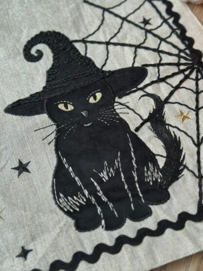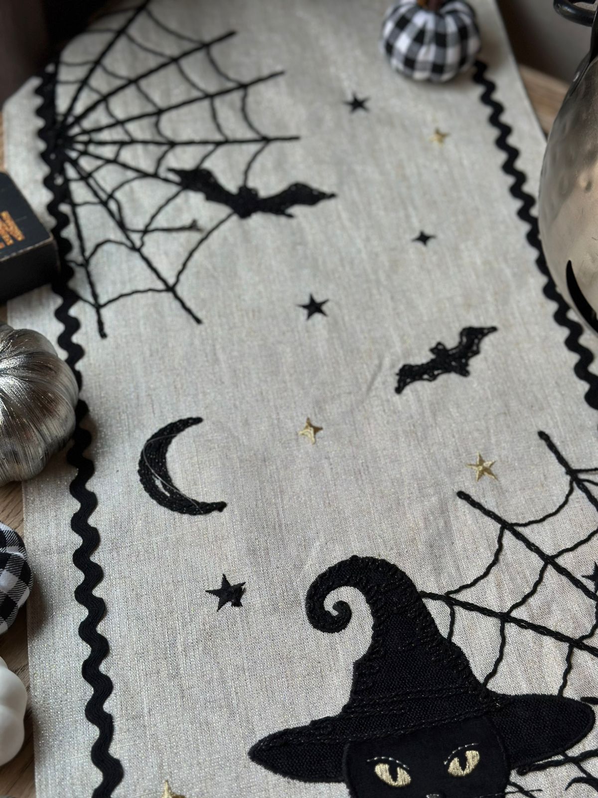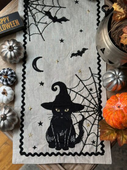 Camino de mesa con diseño de gato disfrazado de brujo.