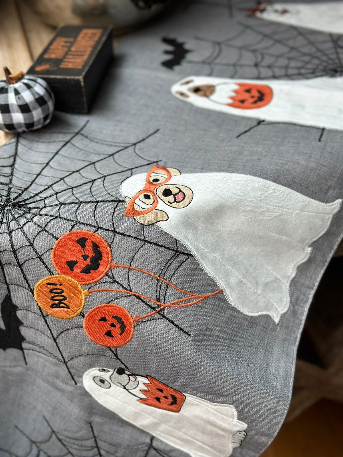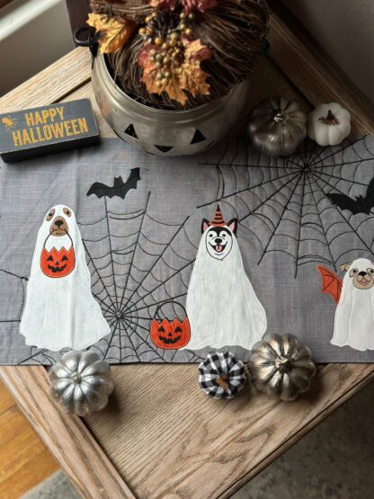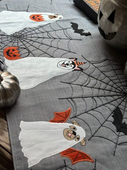 camino de mesa con diseño de perros en disfraz con aplicaciones y bordado.