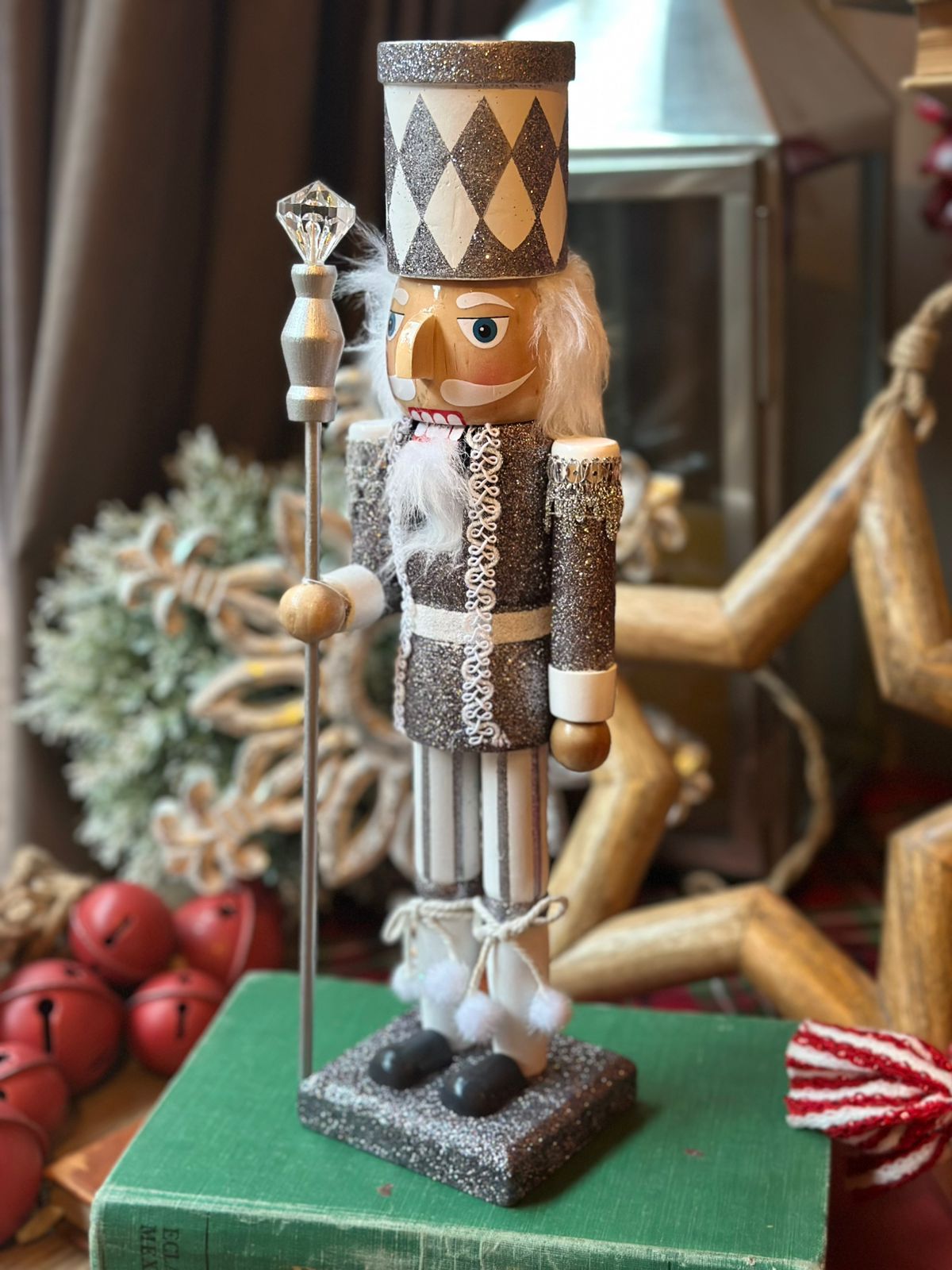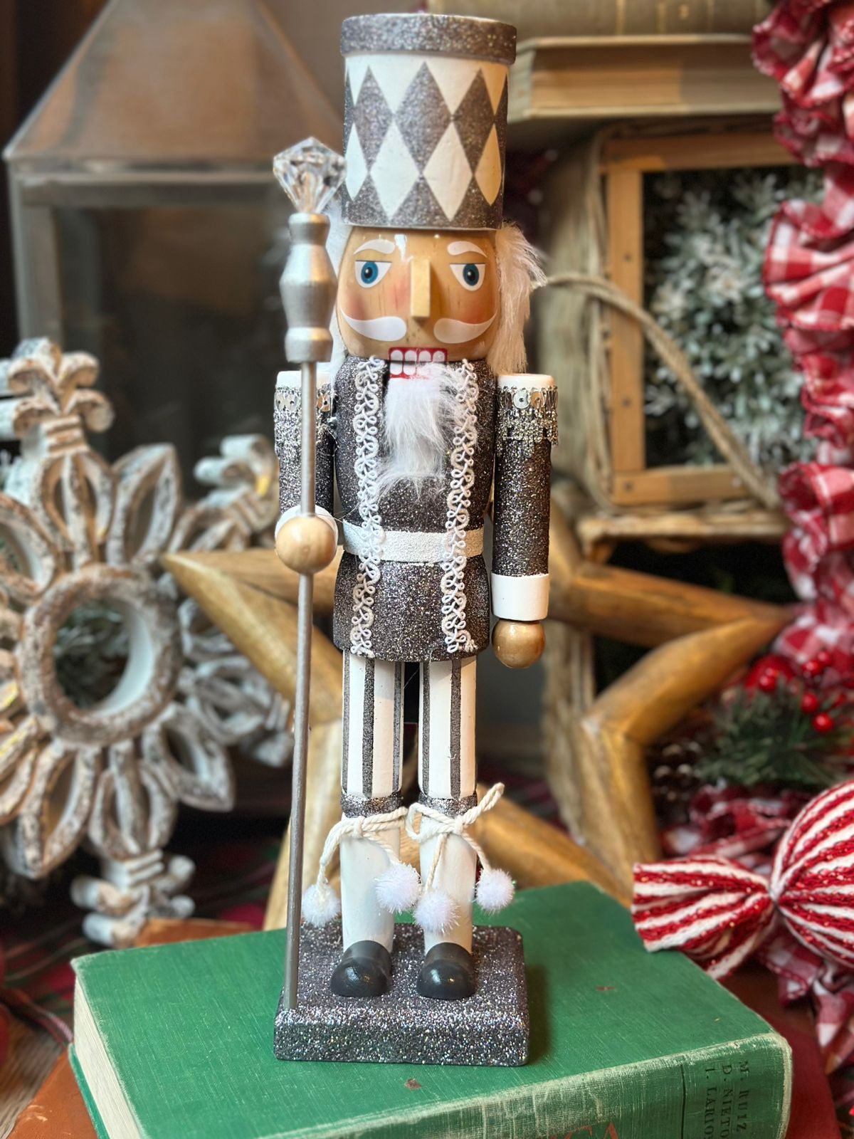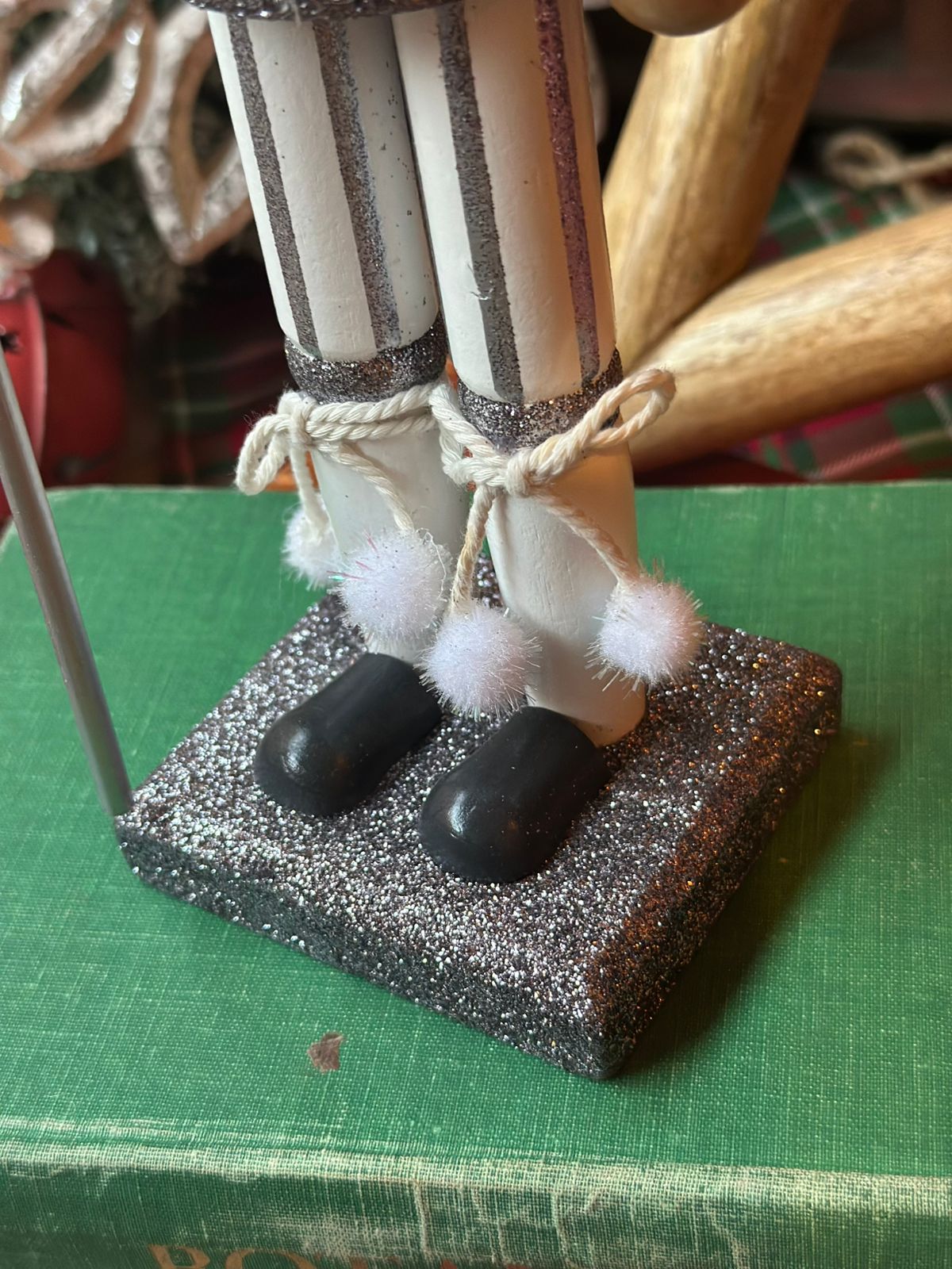 Cascanueces de madera con sweater y motivos plata. Trae pompones en sus botas.