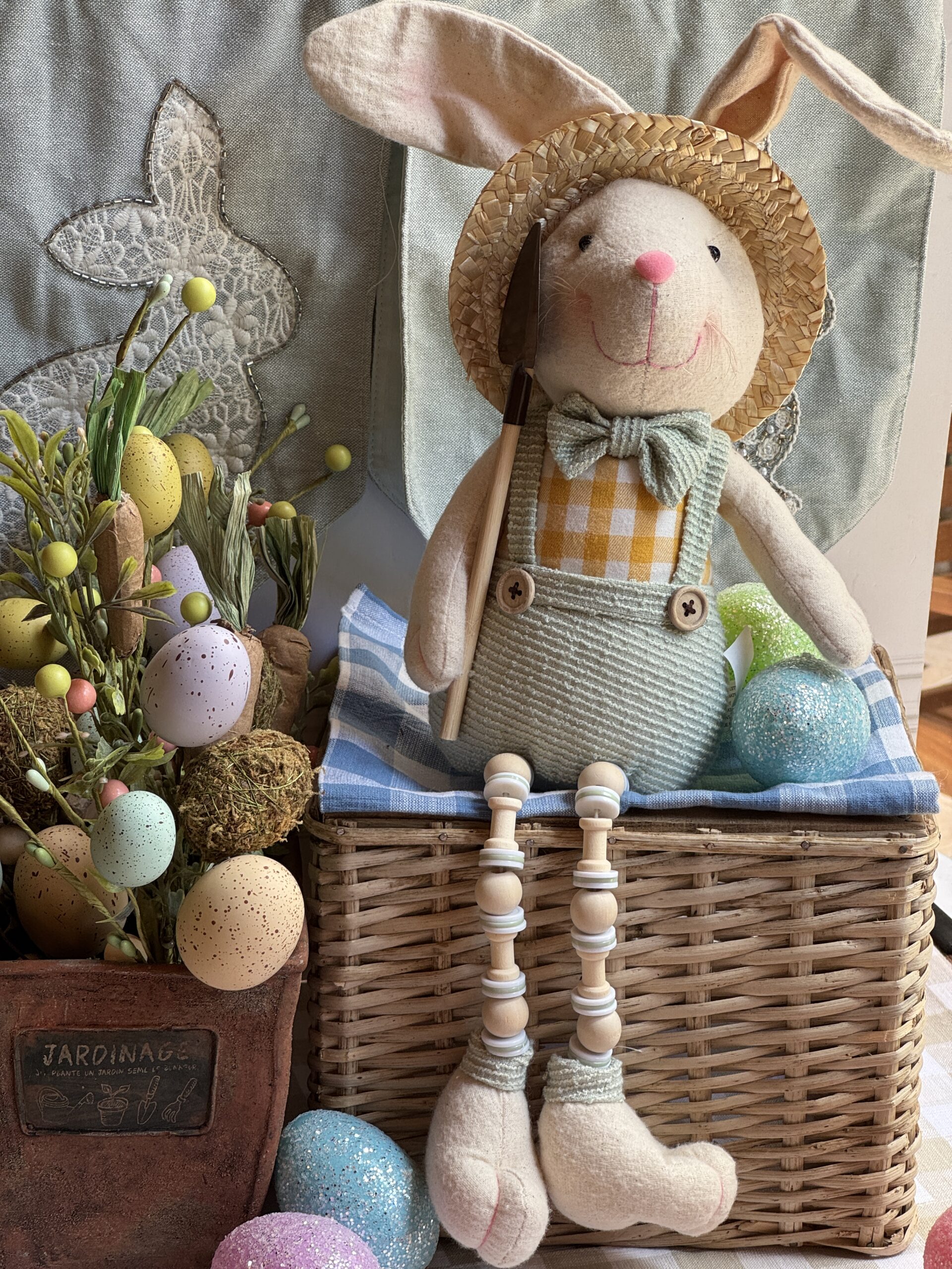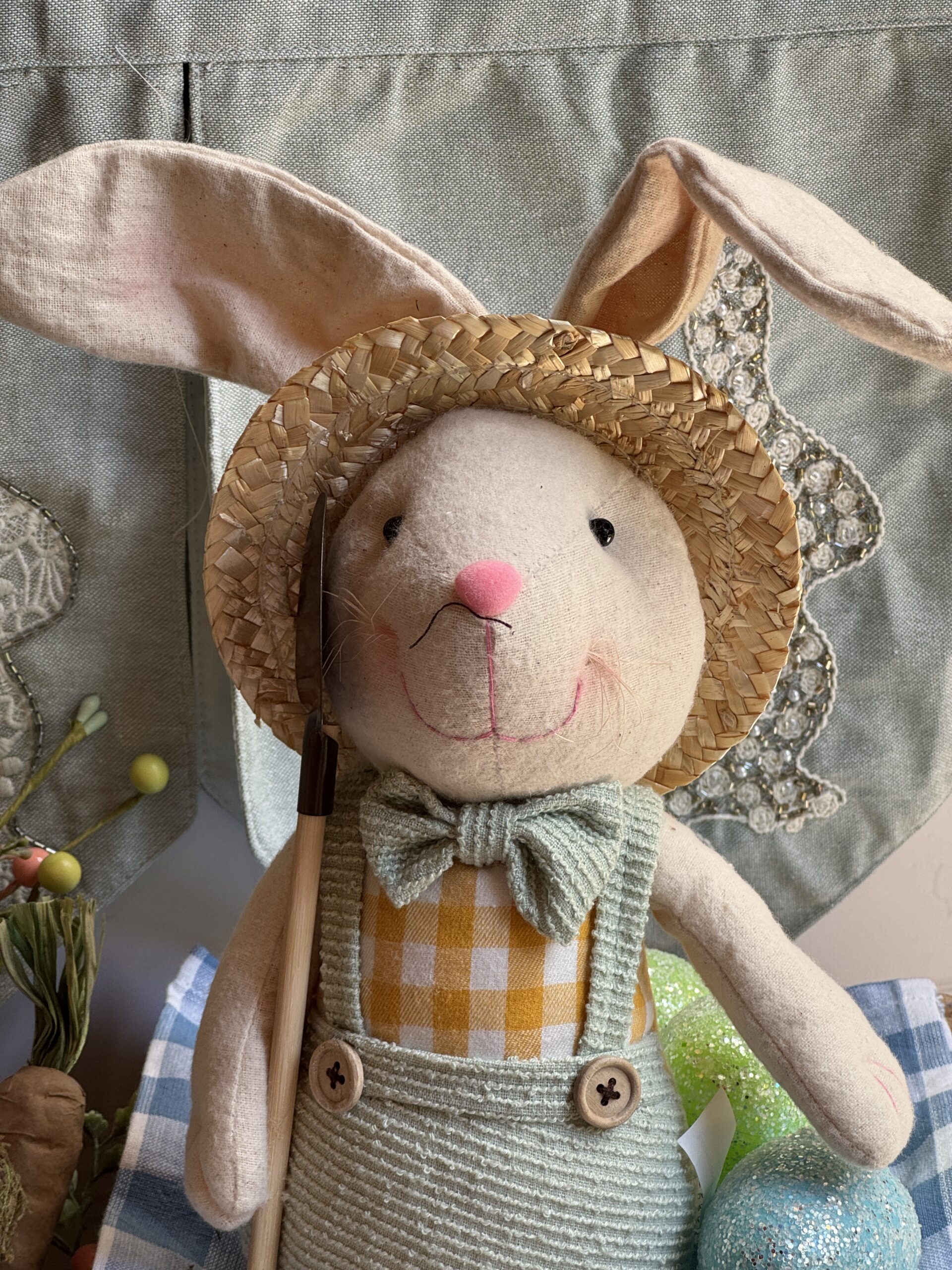 Figura de conejo con sombrero y pala de jardinero.