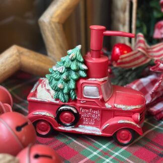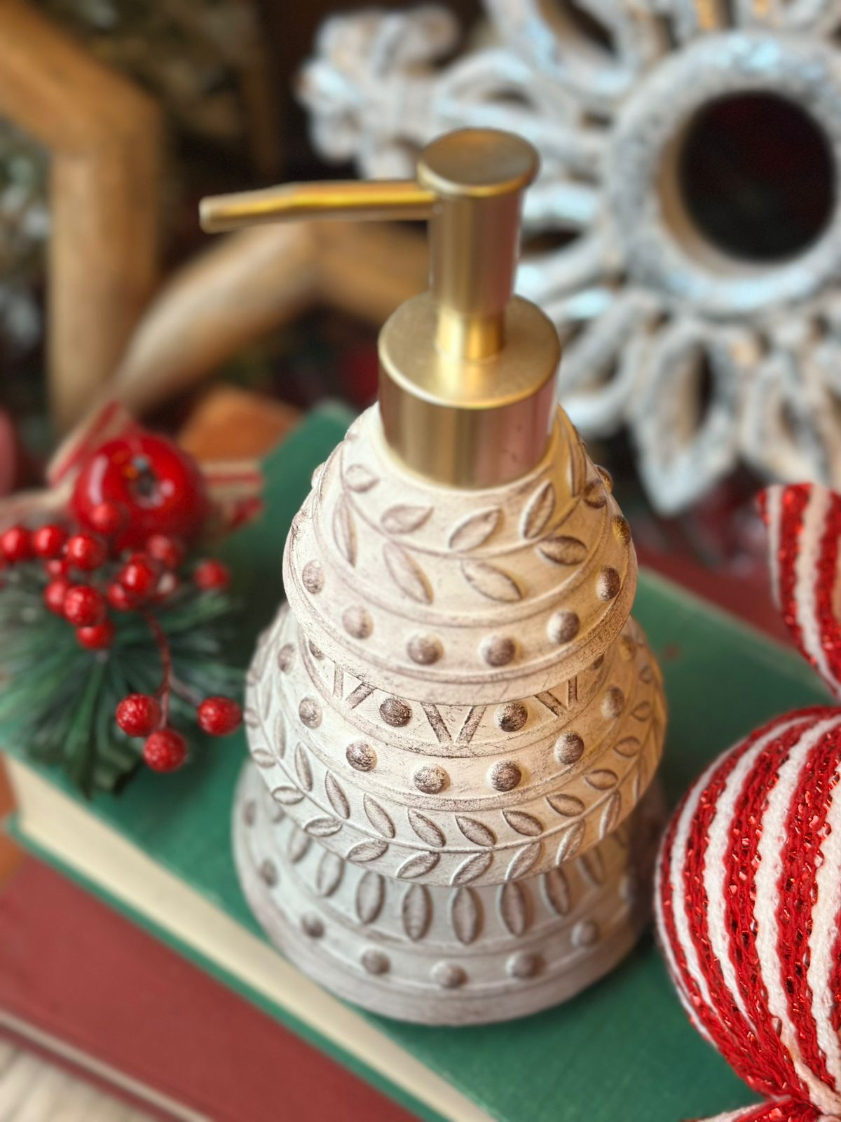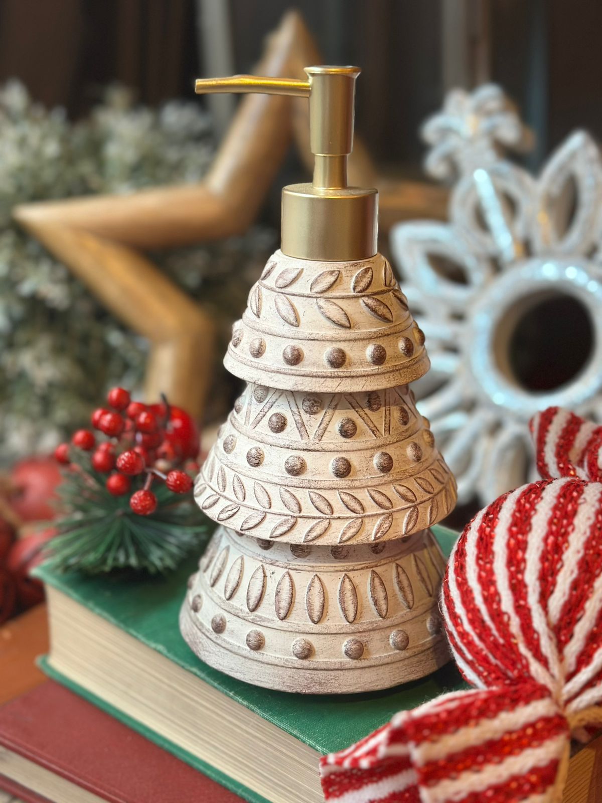 Despachador de jabón con forma de pino tallado.