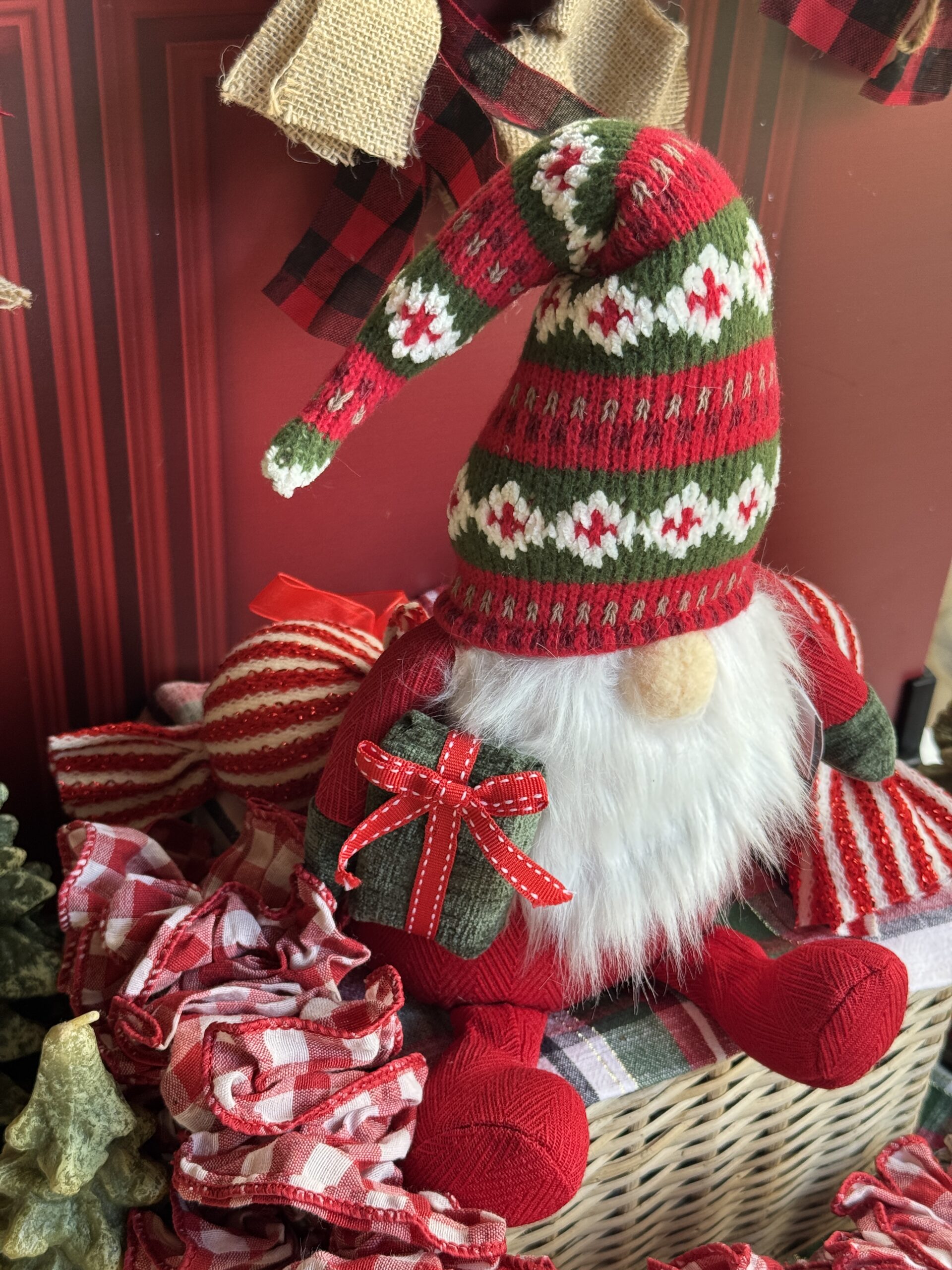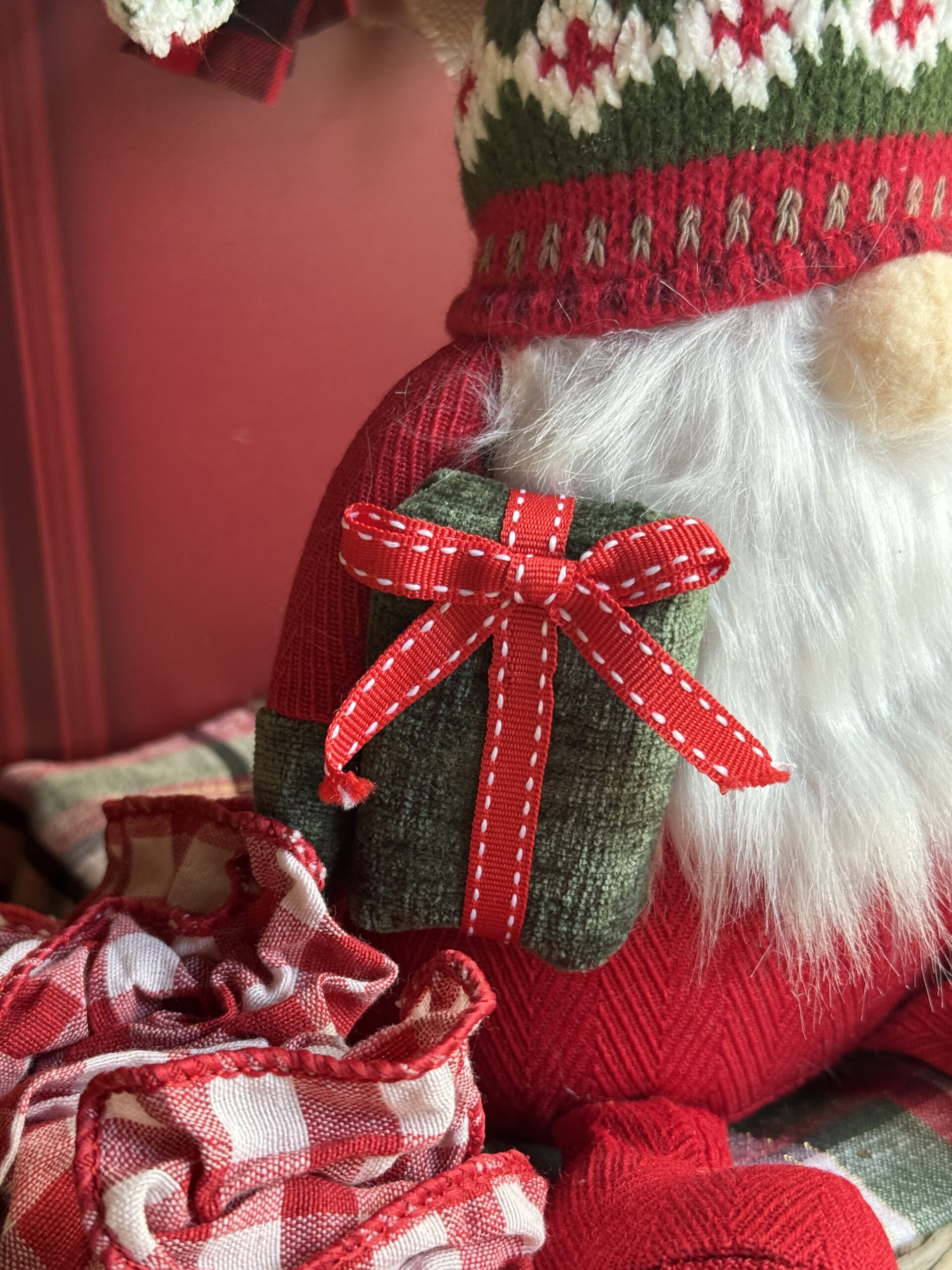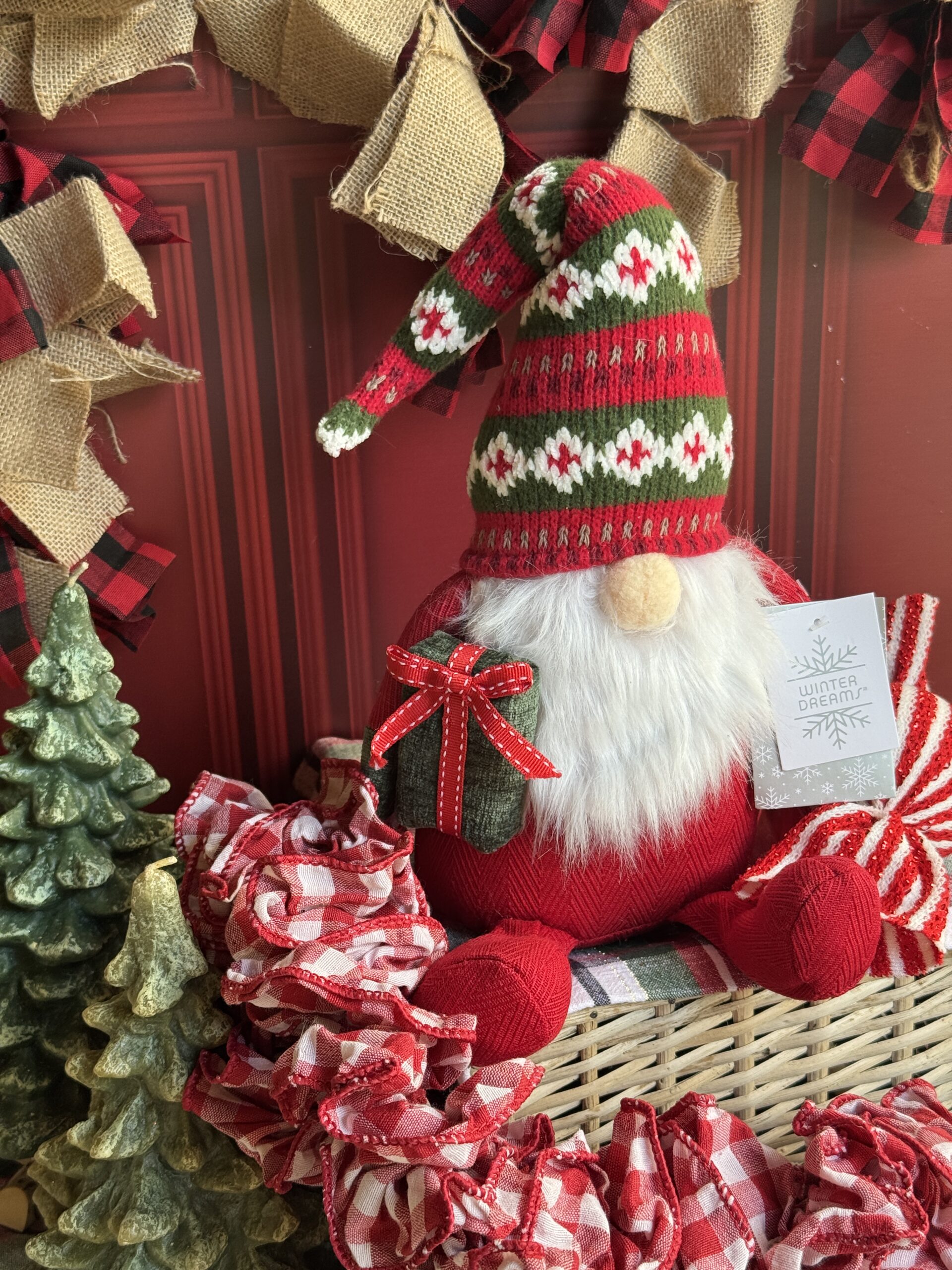 Muñeco gnomo con regalo en mano y gorro tejido.