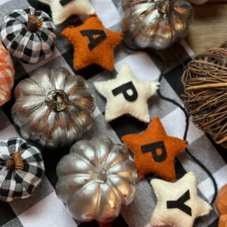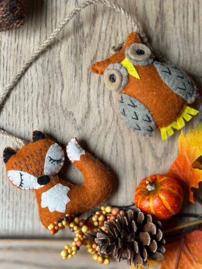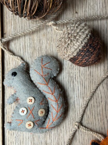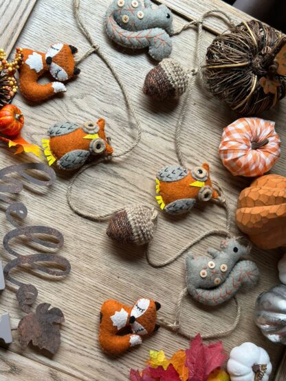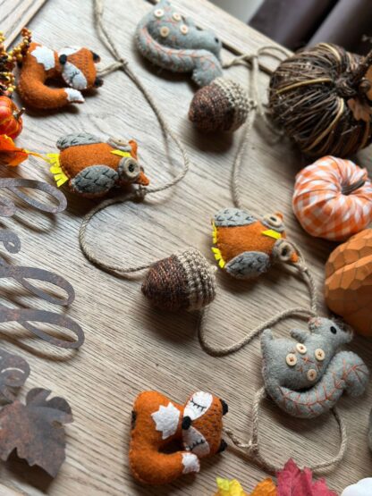Original guirnalda en fieltro de lana con zorros, ardillas y piñas.