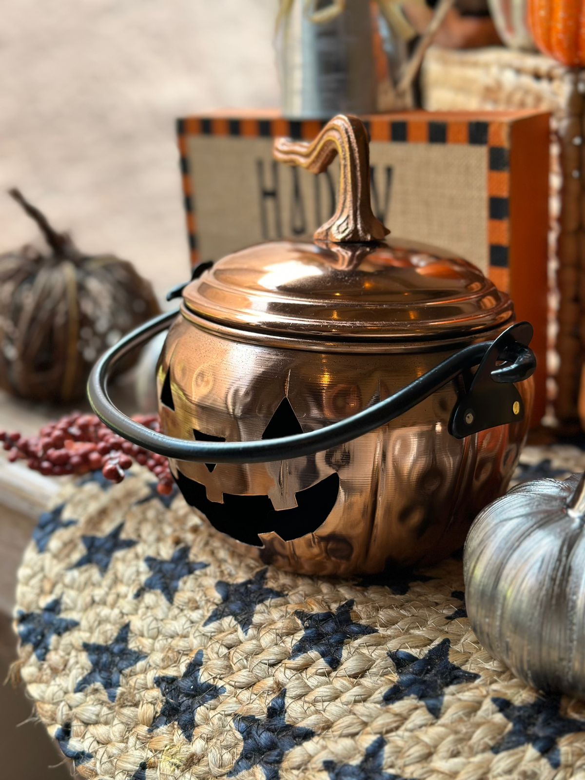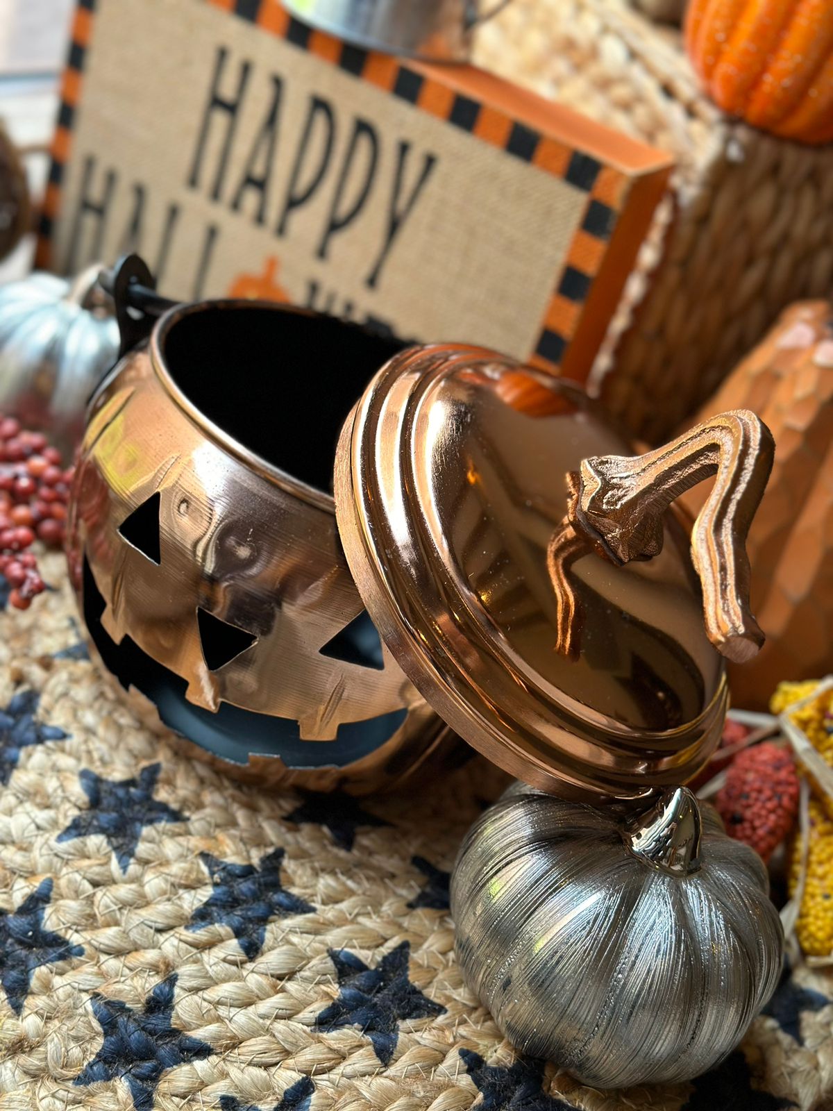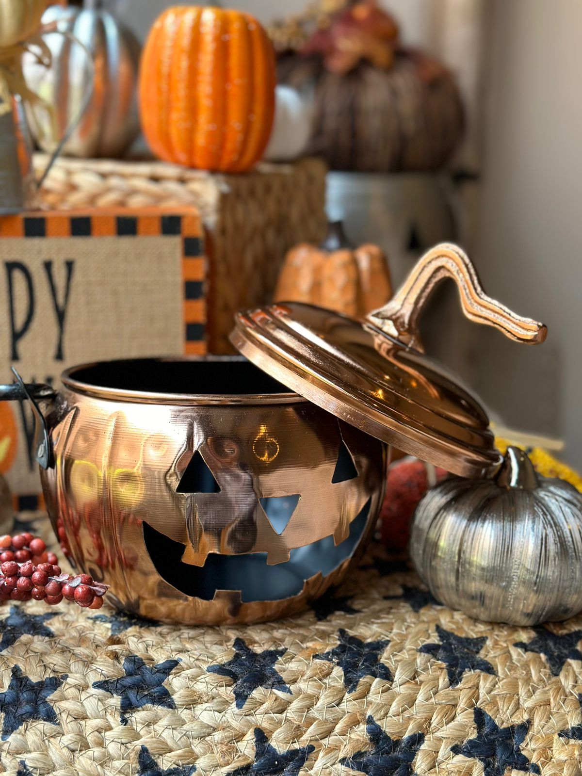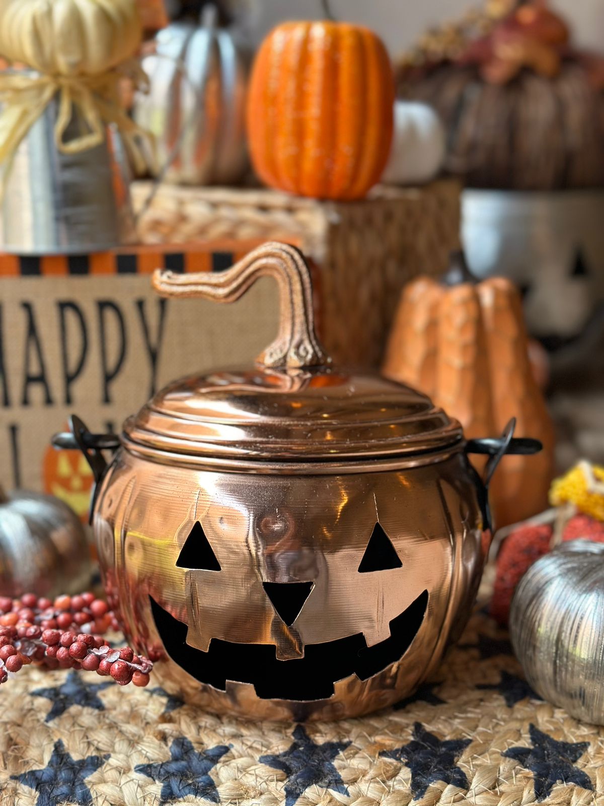 Original cazo de calabaza de cobre con tapadera con rabito de calabaza.