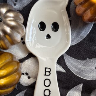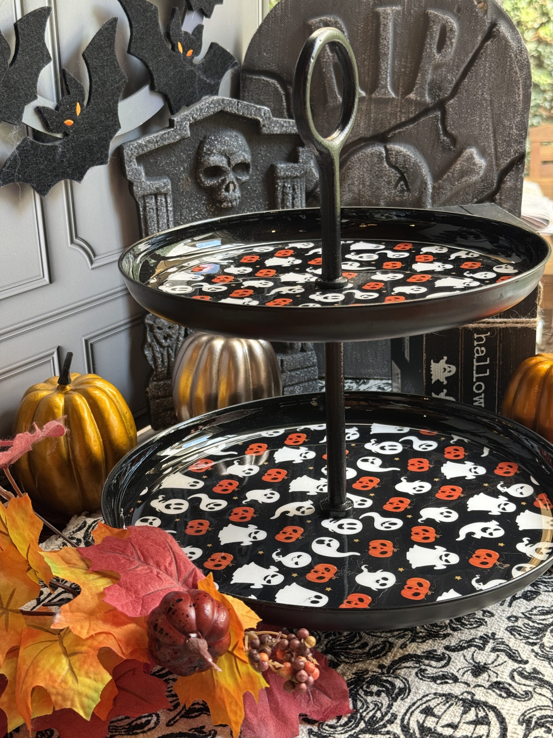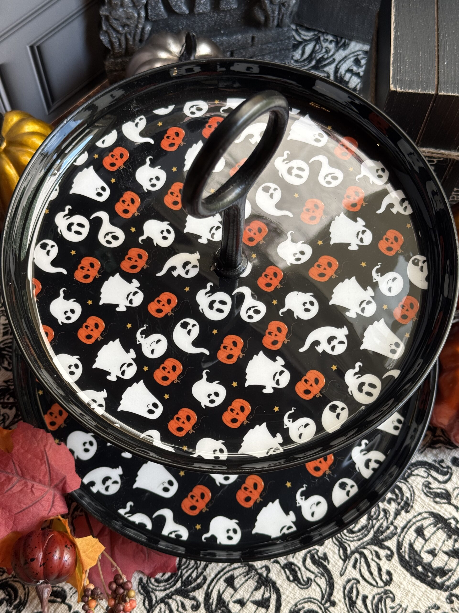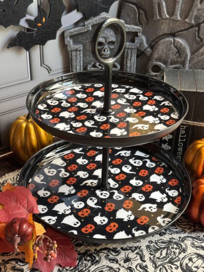 Estante de 2 pisos con diseño de calabazas y fantasmas.