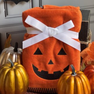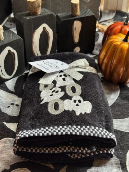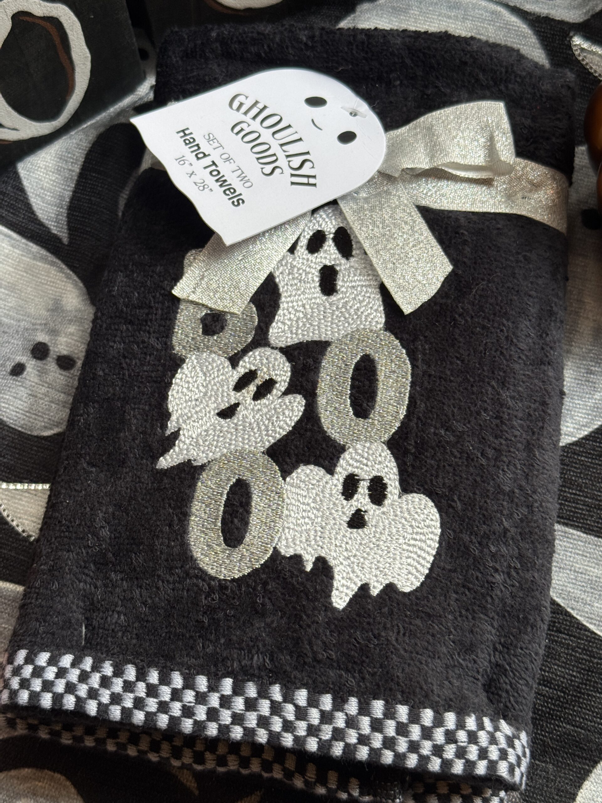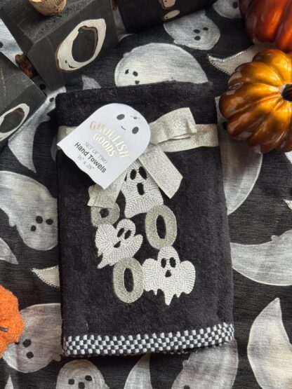 Set de 2 toallas de mano bordadas con fantasmas y letras Boo intercaladas.