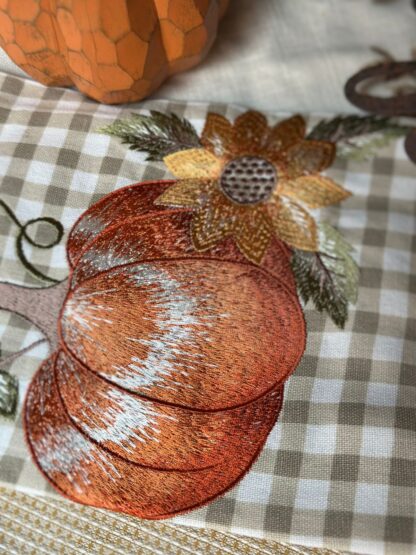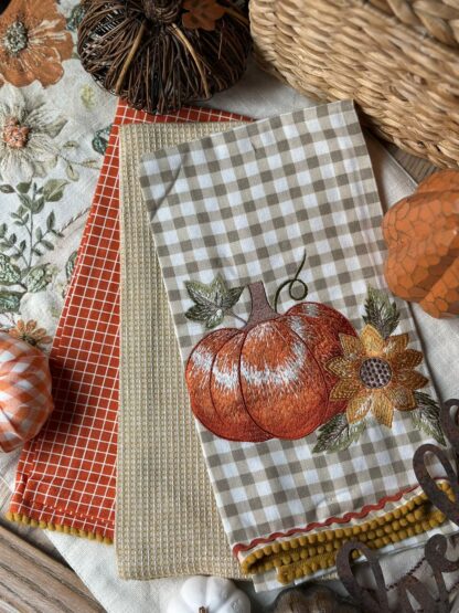 Set de 3 toallas cocina calabaza cuadros bordado con aplicaciones.