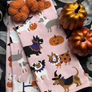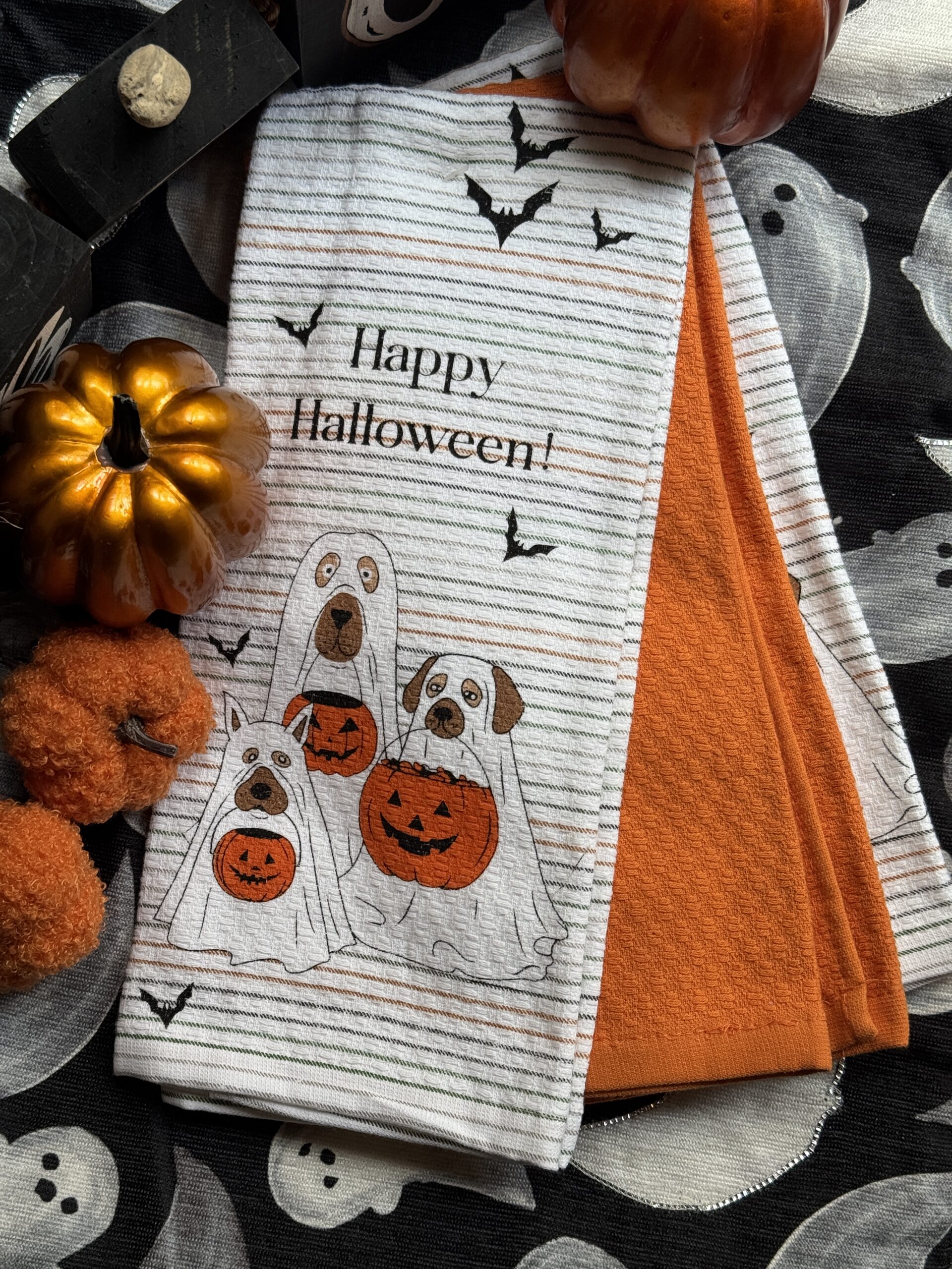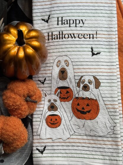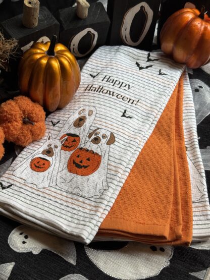 Set de 3 toallas de cocina con perros disfrazados de fantasmas pidiendo sweet or trick.