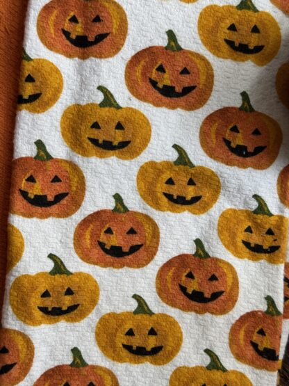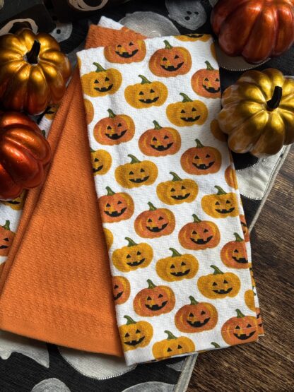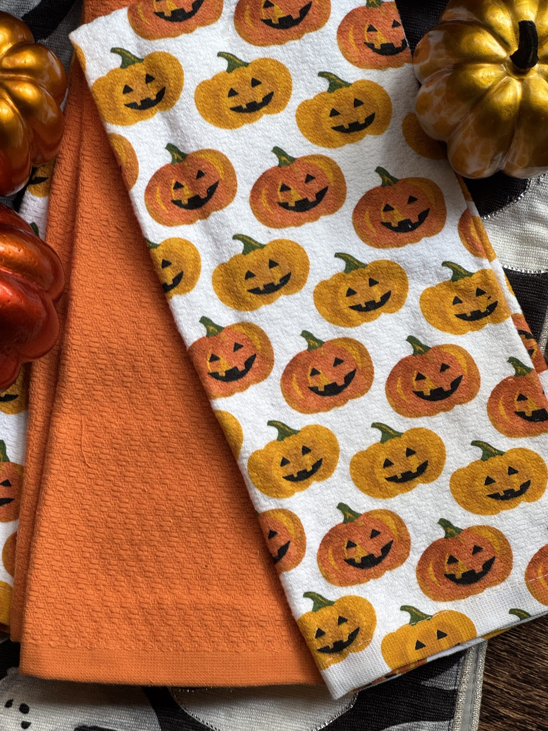Set de 3 toallas de cocina de calabazas happy faces y una en tono naranja.