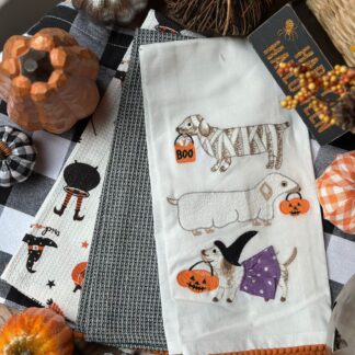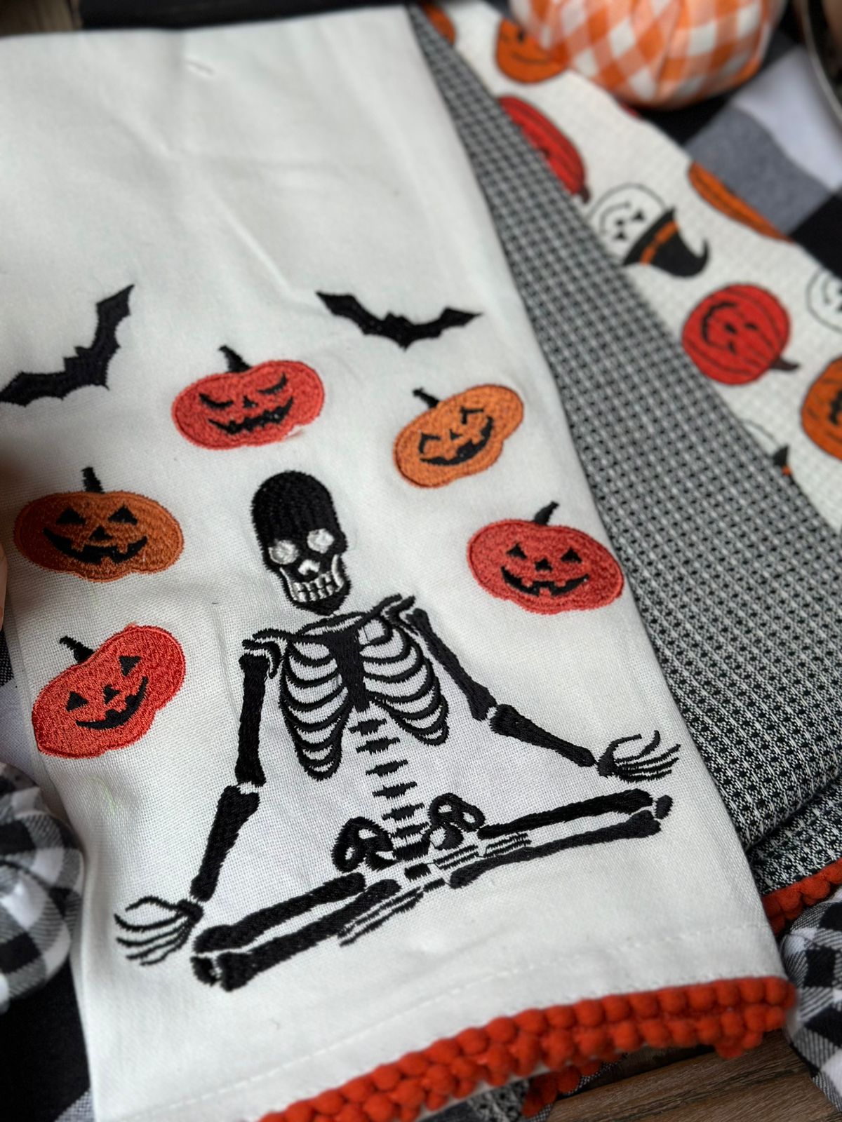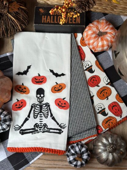Set de 3 toallas de cocina esqueleto yoga bordado con aplicaciones.