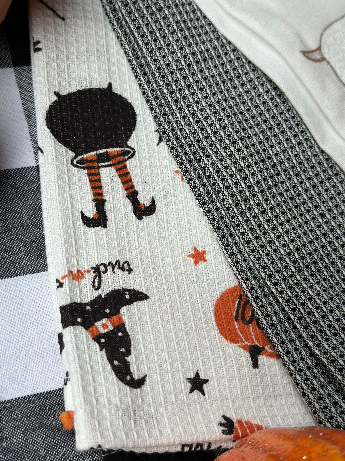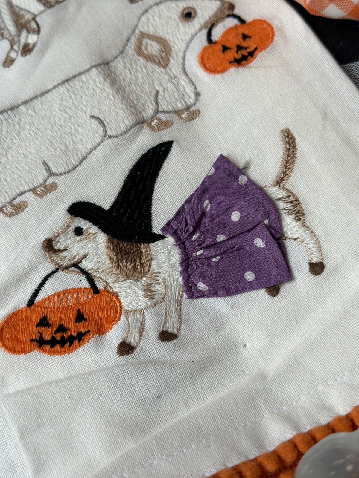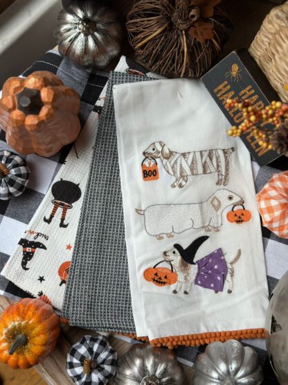 Set de 3 toallas cocina con diseño de perros disfraz bordado con aplicaciones.