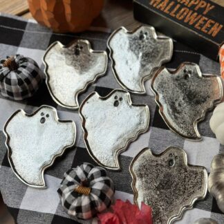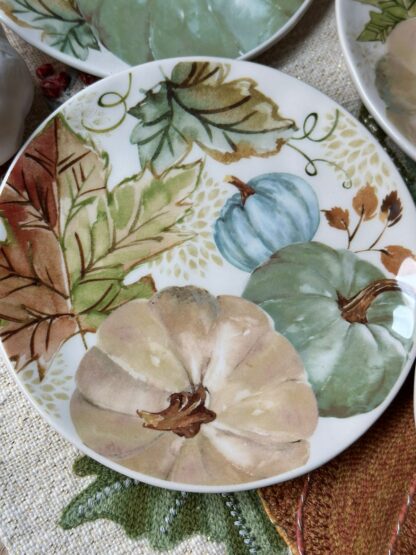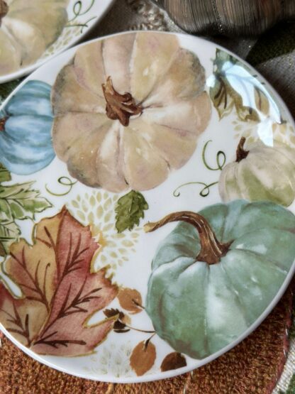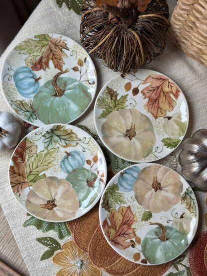 Set de 4 platitos de cerámica con diseño de calabazas en tonos neutro.
