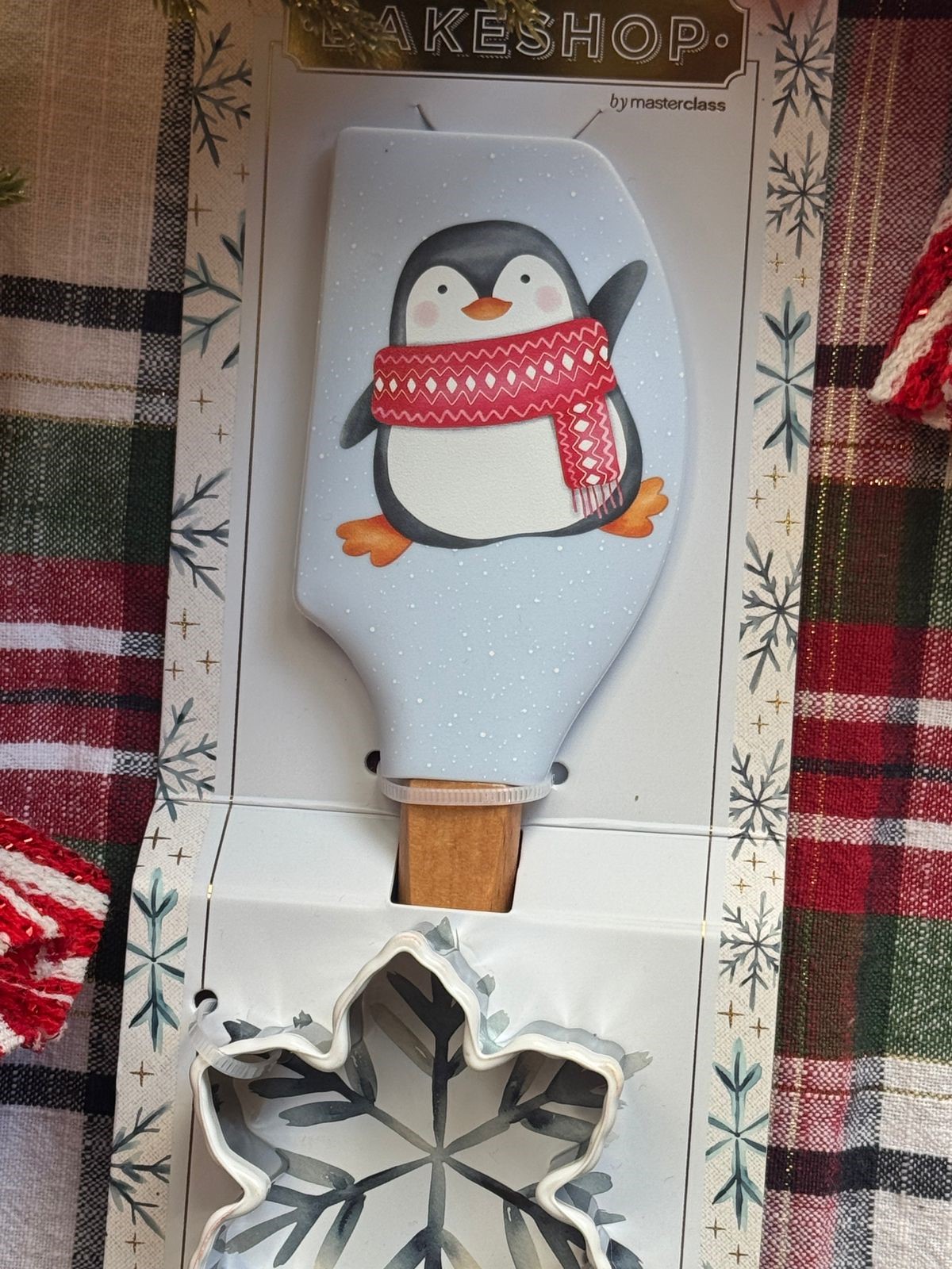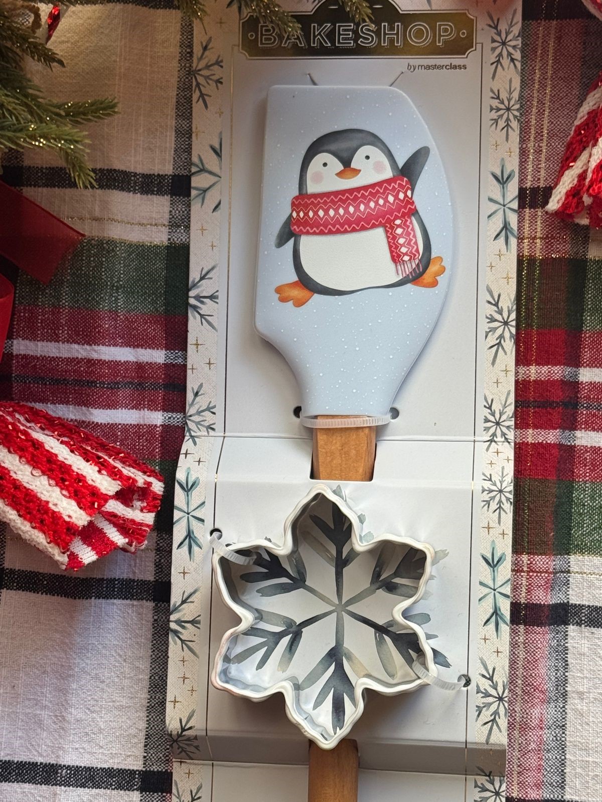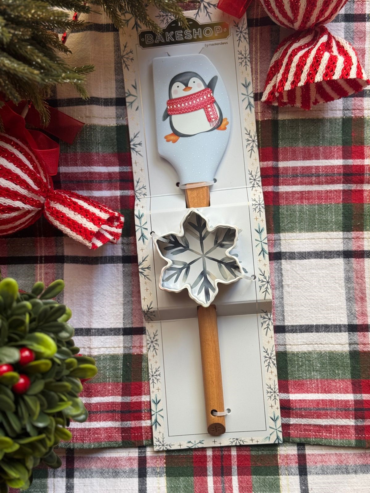 Set de espátula para hornear estampada con árbol y molde en forma de copo para galleta.