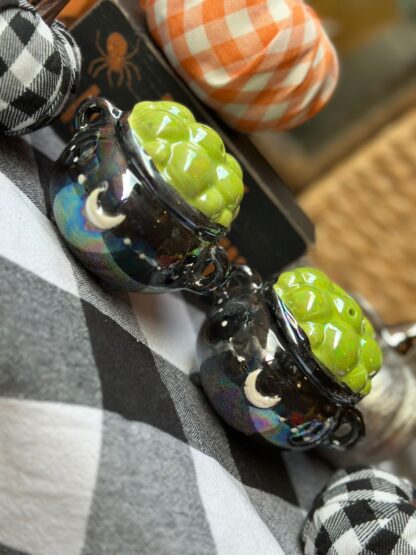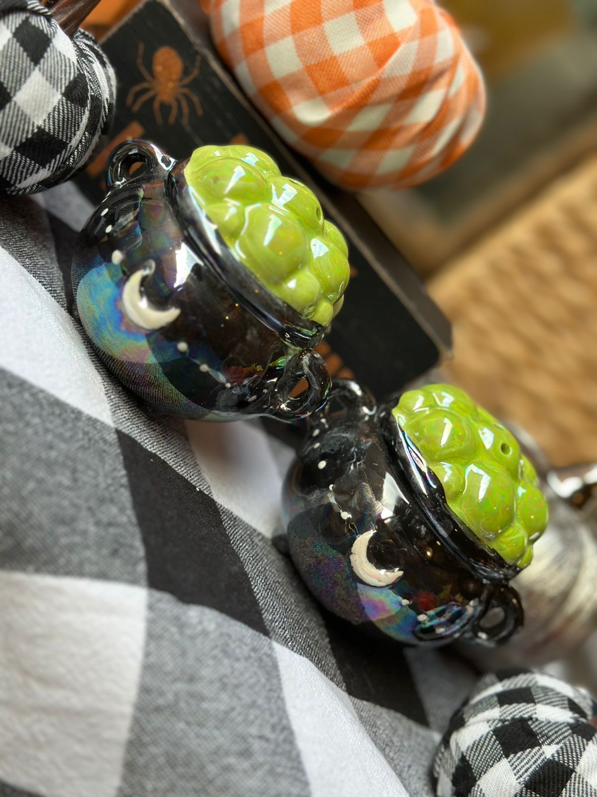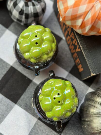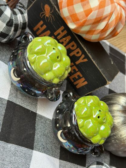 Set de salero y pimentero con forma de calderos de bruja con veneno.