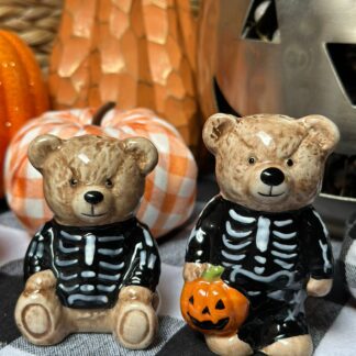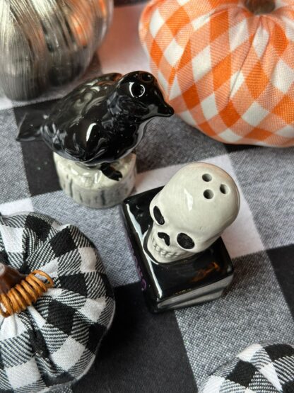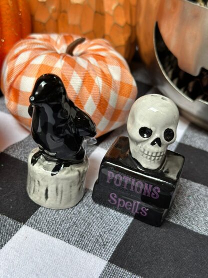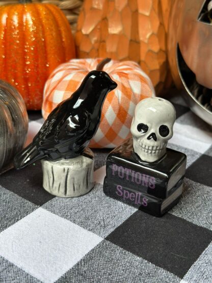 Set de salero y pimentero con forma de cuervo y libro poison y calavera.