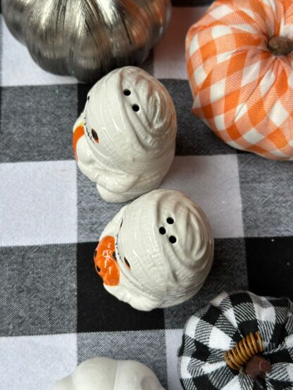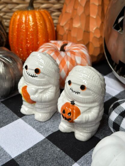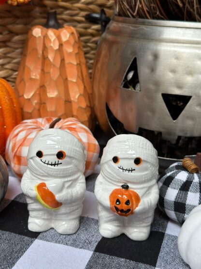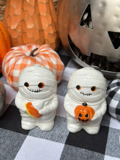 Set de salero y pimentero con forma de 2 momias, con candycorn.
