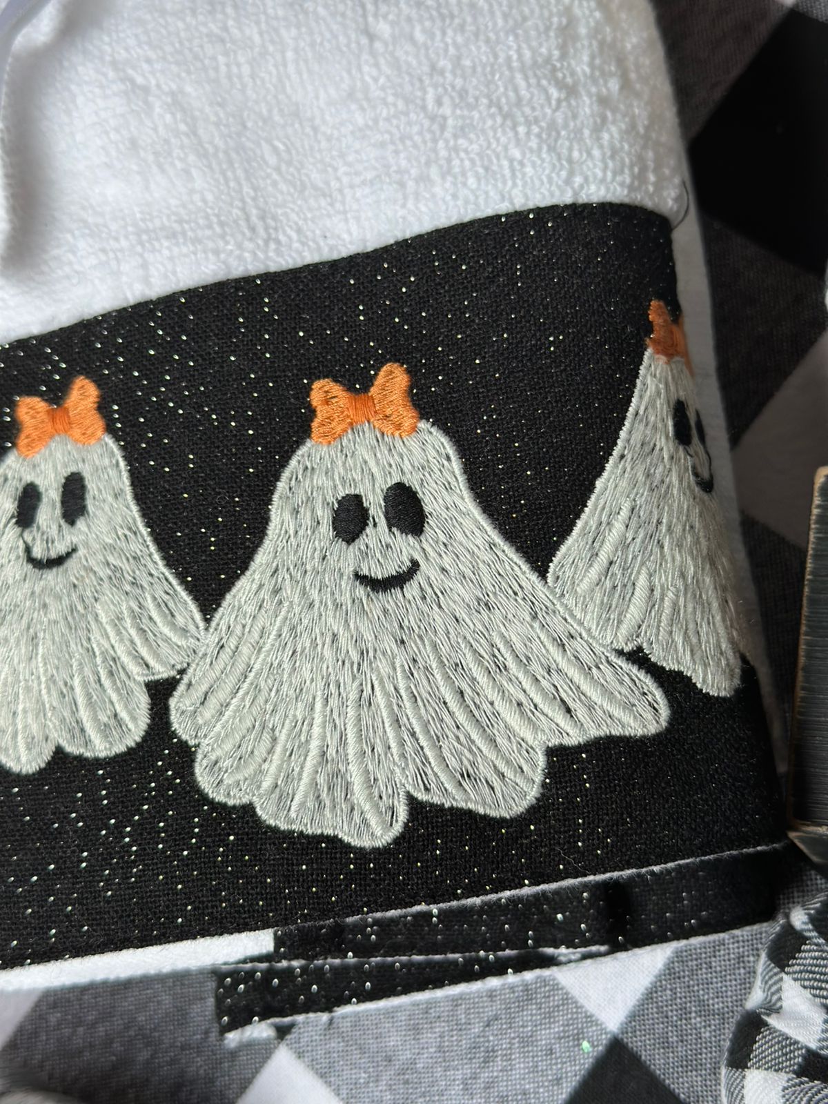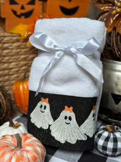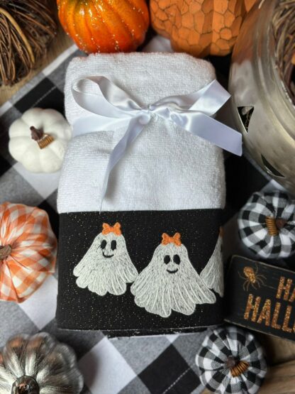 Juego de 2 piezas bordado con diseño de fantasmas negro en cenefa.