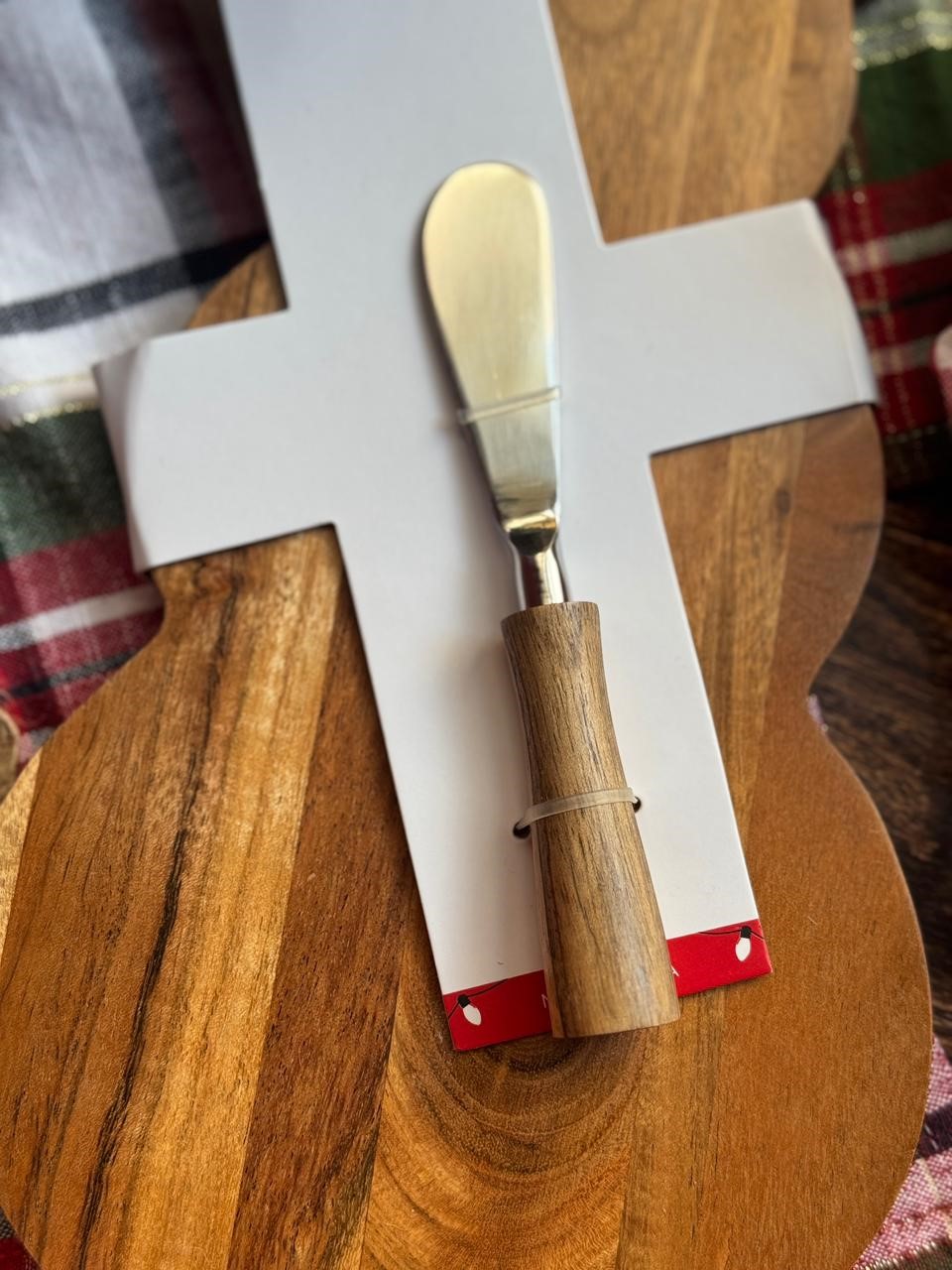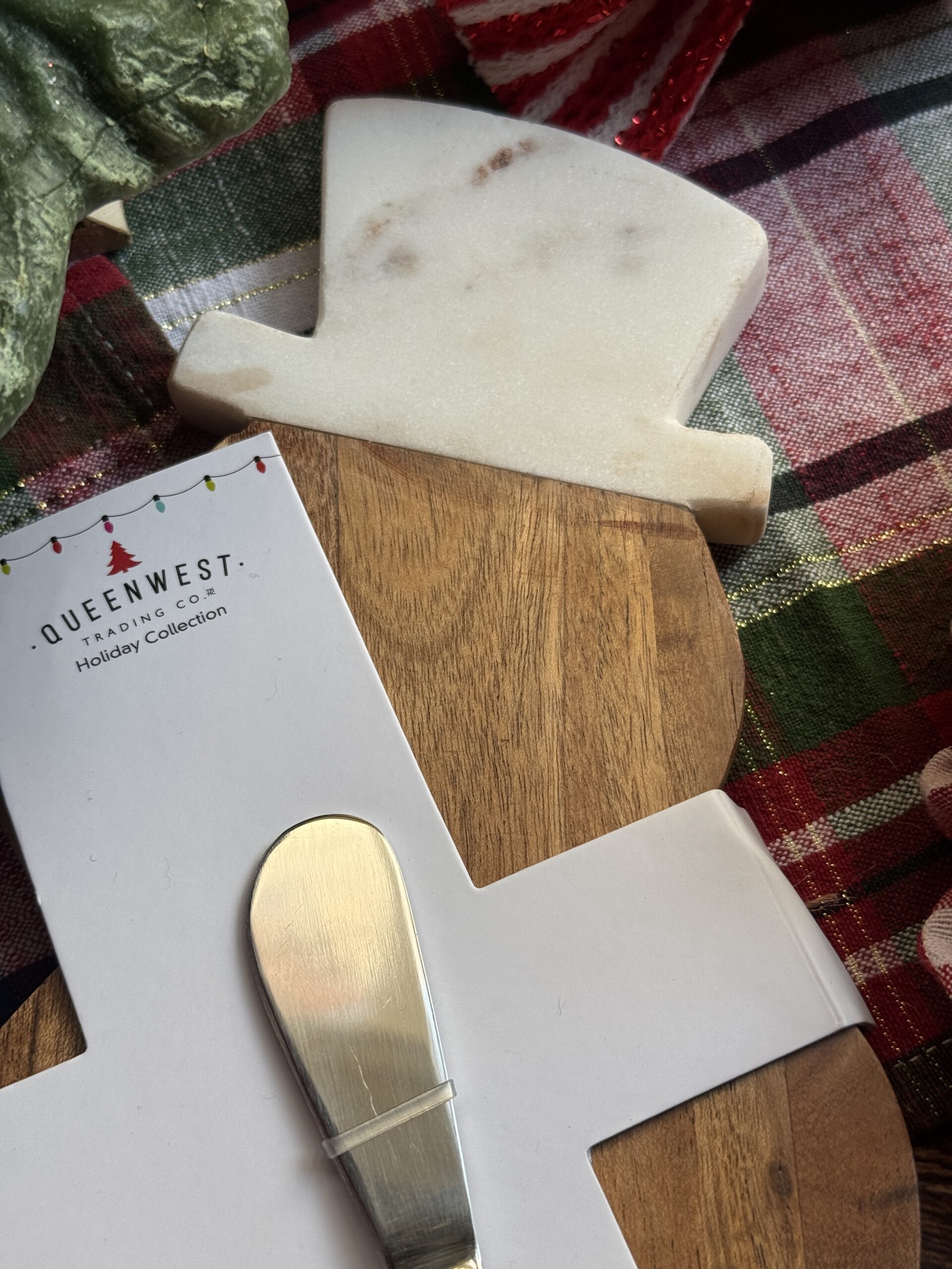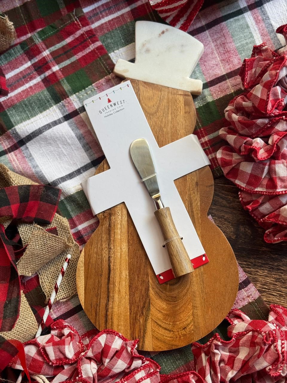 Tabla de quesos en forma de snowman de madera con sombrero de mármol y palita de servicio.