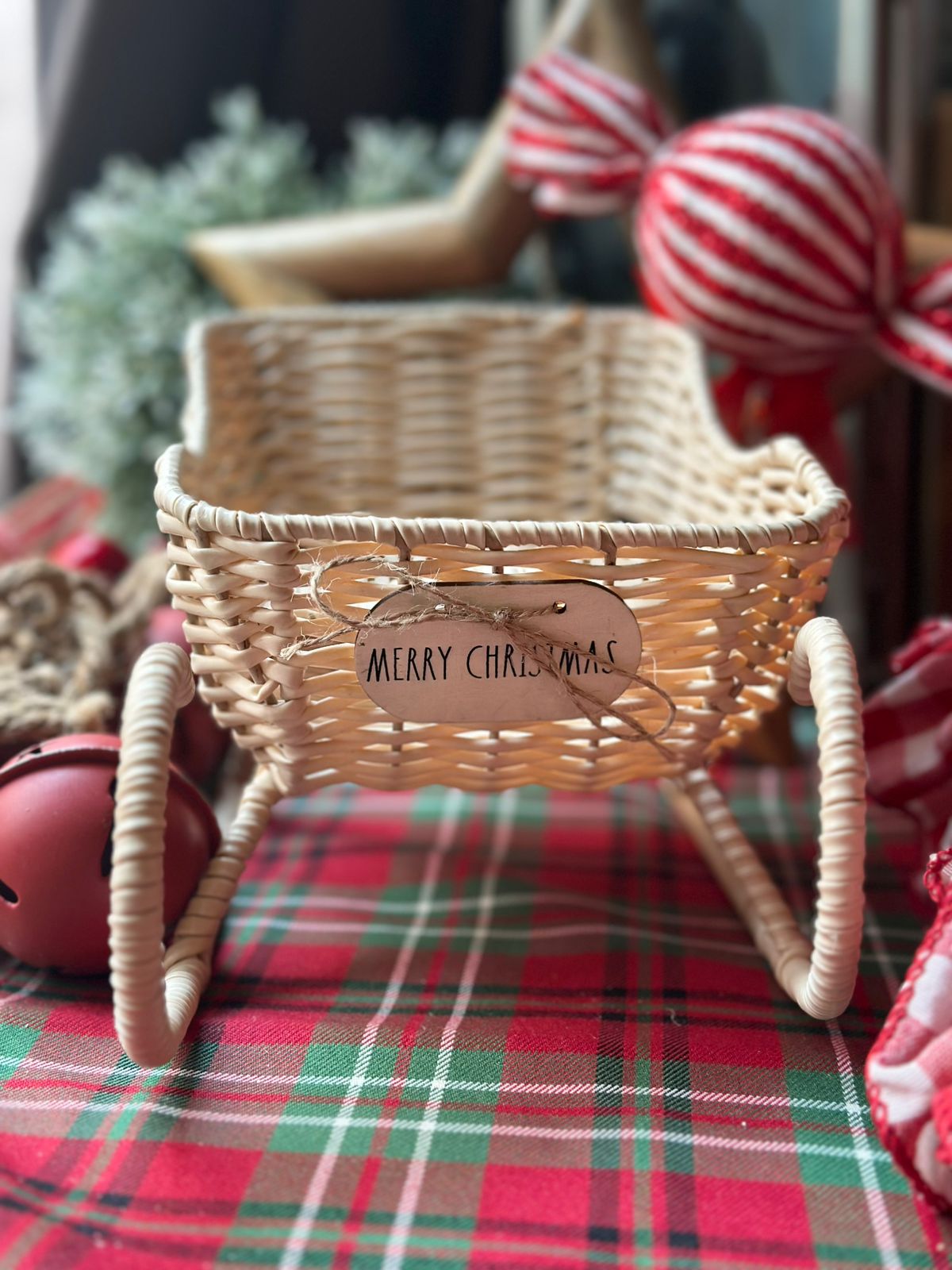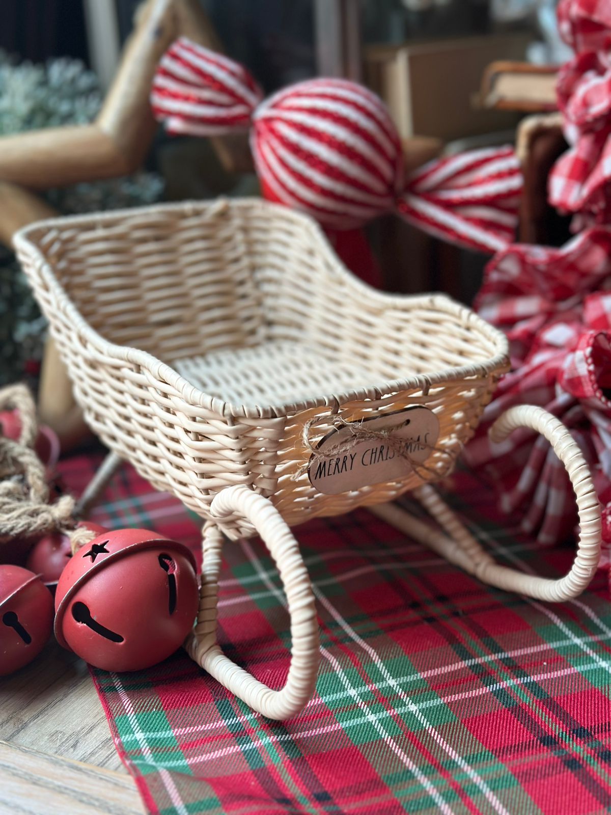 Original trineo beige que puede servir como panera o decorativo.